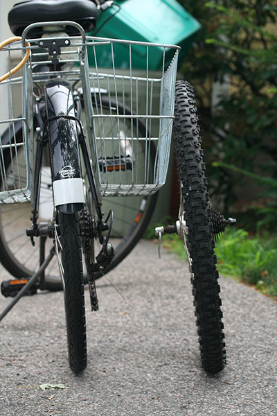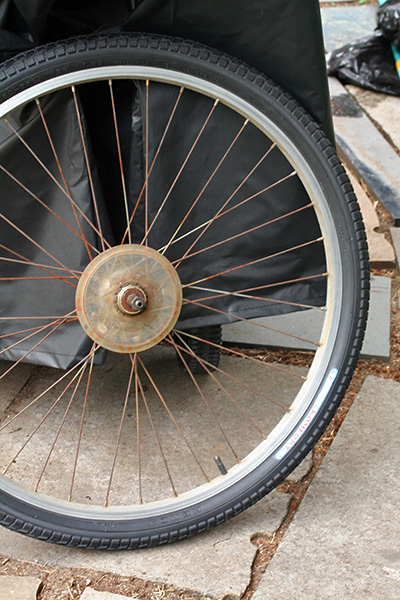 the new wheel doesn't wobble like the spare mountain bike wheel (that may just be a matter of a loose screw somewhere), which is excellent. unfortunately the rim isn't 100% true and rubbed against the brake pads during testing. i fixed the problem by widening the gap between the brakes but the result is diminished stopping power. i'll need to true the wheel at some point, which i'm not looking forward to doing because it's kind of difficult and i'm not quite sure i'm doing it right.