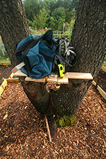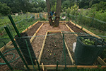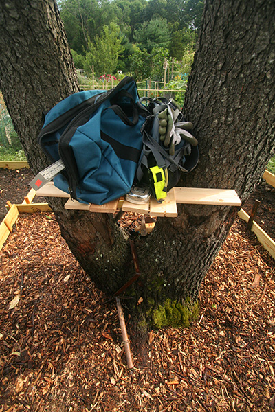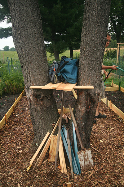 we went in the afternoon, at the very least water the seeds, check for animal damages, and do some measurements. my father went to the victory garden by himself on thursday to construct a wooden platform sandwiched between the 2 diverging trunks of the tree. he also reinforced some of the raised bed walls with spare metal brackets he had lying around the house. he also said on his last visit he noticed one of the green pegs in the middle box had been uprooted but no visible signs of digging.