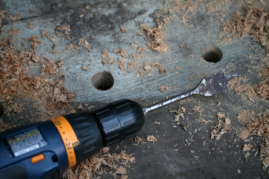 the first hole took the longest to drill, only because the battery was dying and i didn't know it. once i switched out the battery, things went much quicker. still, the wine cask is about 1.5" thick, so it wasn't that easy to drill. i managed to get through 4 holes before the battery finally gave out on the 5th hole. it was getting late anyway (8:15) and i didn't want to be known as that noisy neighbor who uses his power tools in the evening. i'll finish that last hole tomorrow morning, do it quick before anyone realizes what's going on (and avoid being branded as the noisy neighbor who uses his power tools early sunday morning when everyone else is still asleep).