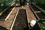 there weren't any new visible signs of damage in the middle zucchini bed, but something had snipped one of the squash seedlings on the western bed. the suspiciously low germination rate on this side makes me think that something had already ate all the seedlings. i ended up planting my one last zucchini seed, and then filled the remaining empty spots with either acorn squash or silver lined melon. while my father was busy hammering a few more wooden stakes and patching some holes in the plastic fencing, my mother was collecting rocks from the garden beds and adding them to the perimeter. i was busy weeding and then watering the beds. i made sure to give the soil a thorough soaking, letting the hose just run free along the side until the soil grew dark.