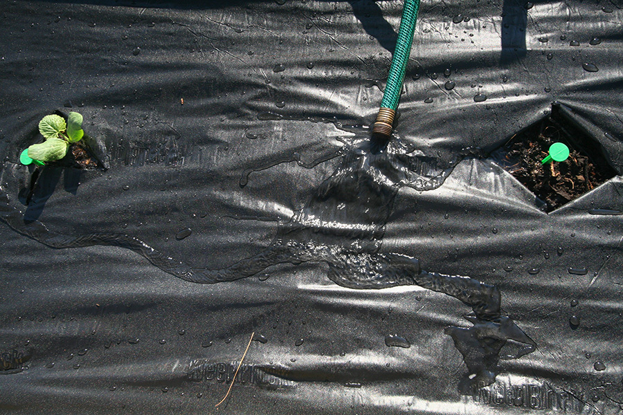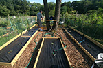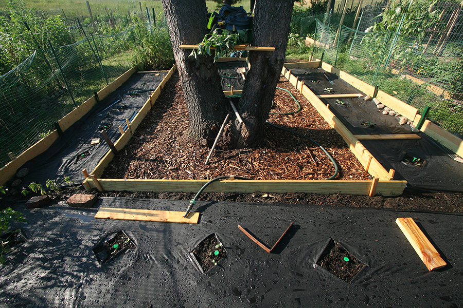 we were primarily there to put down some plastic landscape fabric. our roll of 3'x50' was just enough to cover all our raised beds. the only exception is the southern bed is actually 4+ ft wide, so there were some exposed soil areas. we'll just have to see how aggressive these weeds can be. we then cut holes to allow the seedlings to poke through. the fabric is actually kind of cool, didn't really feel plasticky, more fabric-like than trash-bag-like. covered with tiny holes, water and air can pass through, but not weeds. water seepage isn't so clear-cut though; based on the surface contour, water can either roll across the fabric or stop and soak through. still, it's better than not having it, as a way of trapping the moisture and keeping the soil warm.