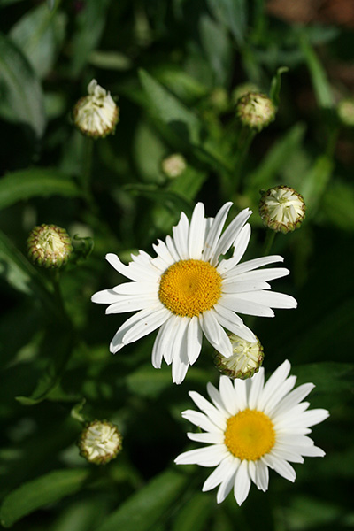 on the flower front, some more shasta daisies. they're sort of low to the ground, no higher than a foot. hopefully they'll grow big enough so they'll be taller next season (they can get as high as 3 feet, my neighbors across the street have a shasta daisy hedge). the delphiniums have begun to produce some flower buds. they seem sort of delicate though, and i recall delphinium flowers are sort of on the dense side, so we'll see how they hold up.