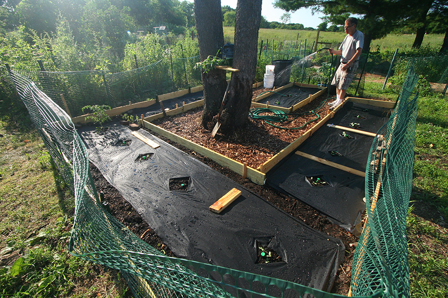 maybe because last time we patched some of the holes in the plastic fence, but there were no further critter damages, at least nothing we could see. rabbits seem to be the main concern in our area of the community garden; along the forest edge, it's mostly chipmunks, followed by the occasional groundhog. with the plastic fencing as it is now, i think we're rabbit-proof for the most part. of course it wouldn't be hard for them to chew through the plastic, which is why most people having wire fencing, with a 2 feet border of additional chicken wire. since it's our first season, we'll see how it goes, and then decide if we should reinforce the perimeters.