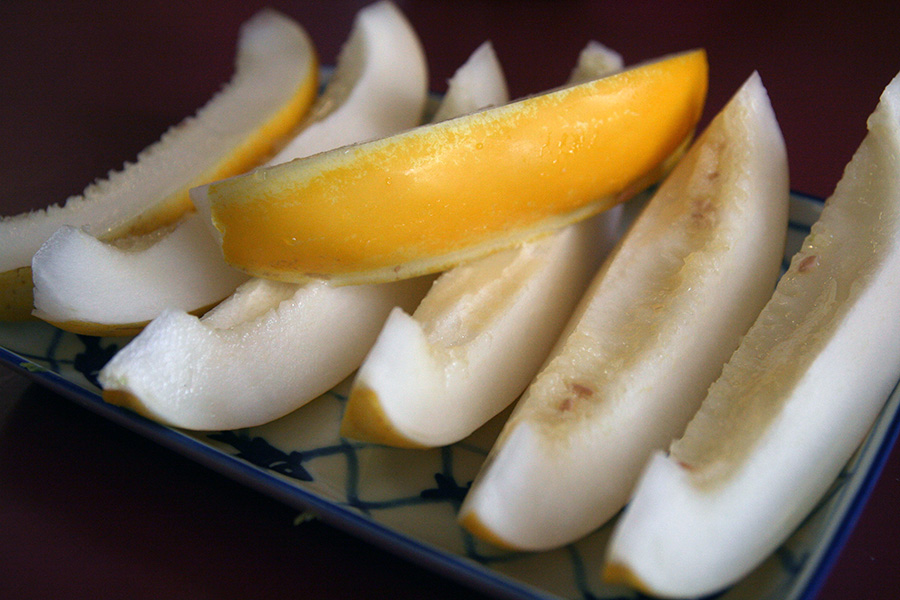 i returned to cambridge via longfellow, heading straight to the cafe to deliver the latest haul. my father sliced up the korean melon. i must've had it before but just forgot. the flesh isn't soft like a traditional melon, but rather crispy, like a cucumber. it's also not as sweet as a normal melon, with a flavor that doesn't overwhelm.