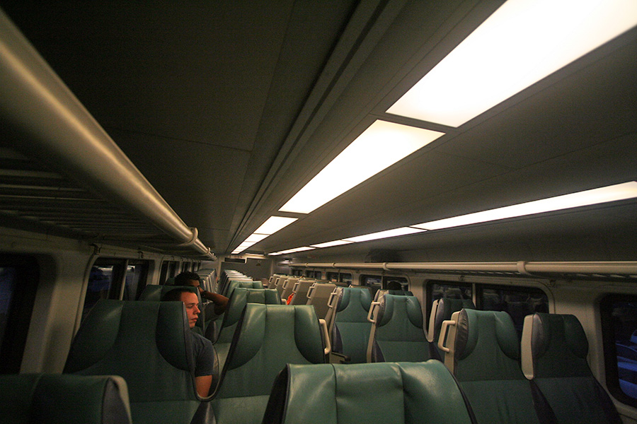 next to us sat a mother with her 3-4 year old daughter. she smiled a few times, unintentionally eavesdropping on our conversation. her daughter must've had developmental issues because she wouldn't stop making noises during the entire trip, stopping only for an hour when she finally fell asleep. the incessant murmuring was annoying, but eventually melded with the other background noises.