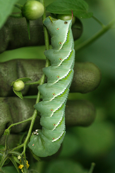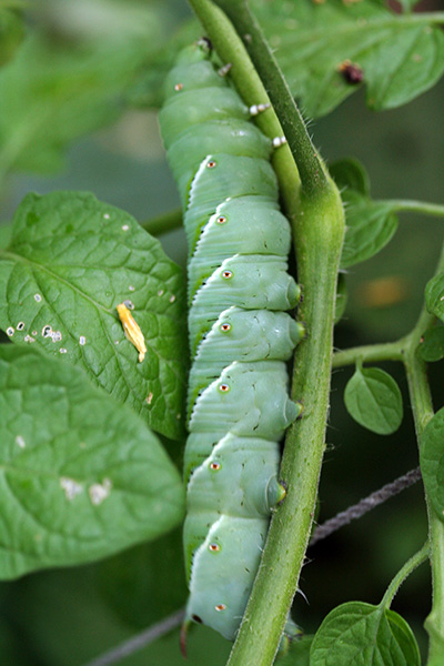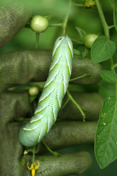 the hornworm was still there, having defoliated a good chunk of the cherry tomato plant, but still the parts i wasn't too concerned about. i noticed there was some bruising on the tail end, not sure if i caused that yesterday or it's natural. maybe it's about to pupate, which is a good thing, because it'll finally stop hiding and burrow into the ground. anyway, i was going to throw it out again but had another change of heart; tomatoes i can grow everything season, but it's a rare event (at least for me anyway) to have a hornworm living in my garden. the amateur entomologist in me won over the amateur gardener.