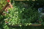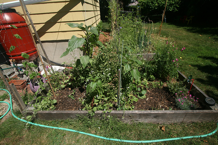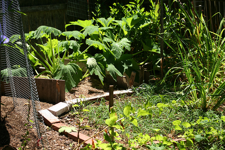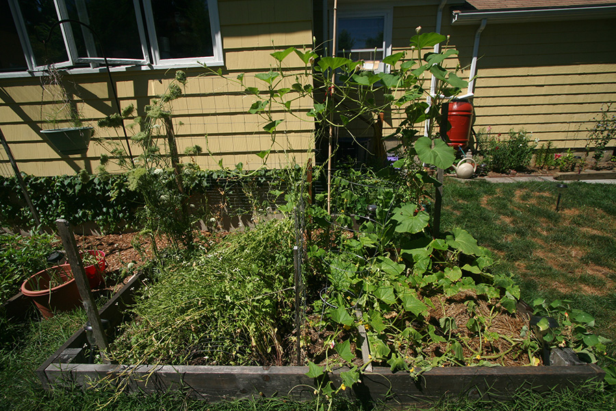 the raised beds in my parents' backyard have gone crazy. partially out of neglect, partially from overgrowth. it's mid-summer and the springtime arugula and radishes should be pulled out to make way for other plants, like the korean melons which are being eclipsed by these older plants. the cucumbers have succumbed to some sort of disease; i pruned off the affected leaves, but i don't know if they can produce any fruits before all the plants die. at least the bottle gourd doesn't seem to be affected; hopefully we'll get some new gourds this season. the 2 zucchini squashes are doing well, no SVB invaders yet, although i saw a few leaves that might be suspect and could need to be pruned off before the borers can eat their way to the trunk.