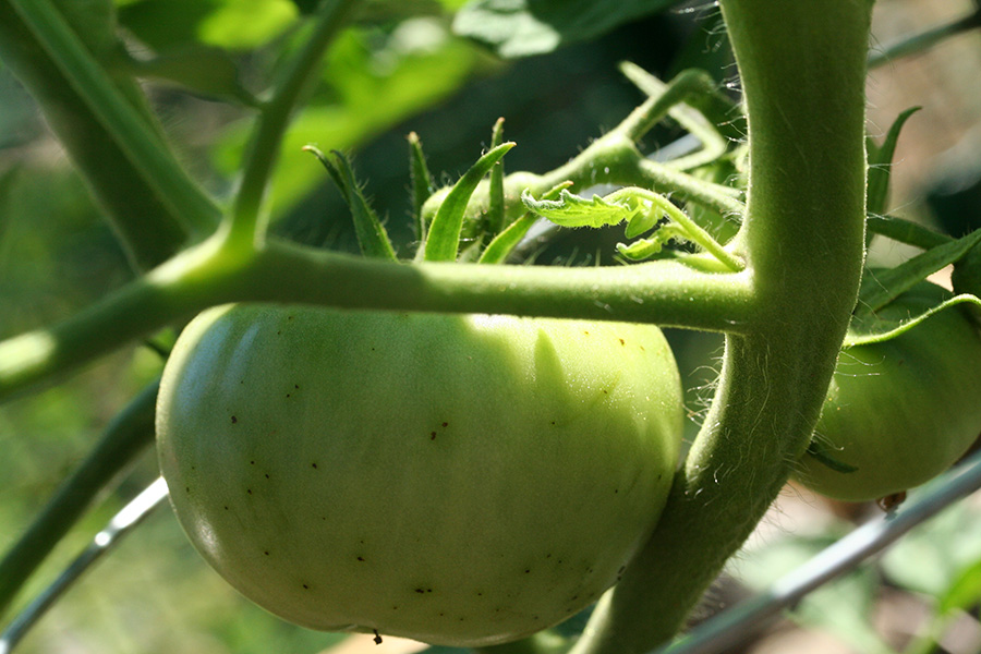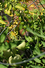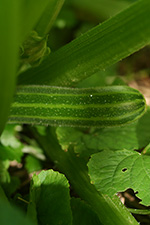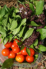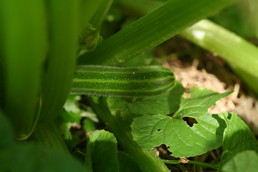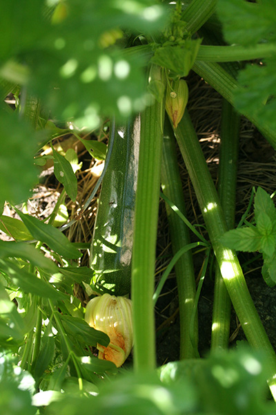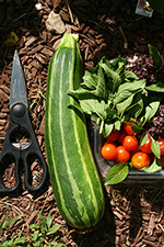 back at home, i went to the community garden around 4:00 to pick some thai basil and a bit of spearmint. i also harvested whatever red cherry tomatoes i saw. while inspecting the squash vine for borer eggs, i came across a fully-developed cocozelle squash that was hidden underneath several layers of leaves. this makes it no.3 for cocozelle. this one had a nice shape, no deformity.