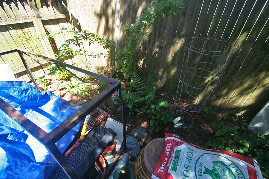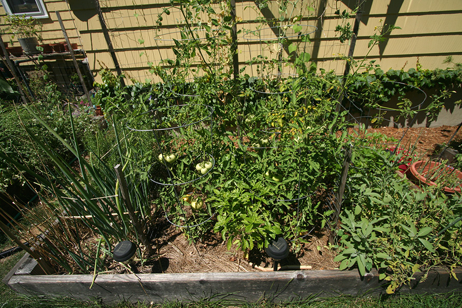 besides watering (which wasn't all that necessary, given that it rained yesterday, and the forecast is for rain both tomorrow and friday), i also did some weeding. bare soil between and around the landscape fabrics, as well as some strong weeds that managed to poke through the layer of wood chip mulch in the paths. also the areas immediately surrounding the plants. just how much weed seeds are in the soil? i know there are things you can do that will sterilize the ground, things like covering it up with a clear plastic sheet during the summer and letting the sun bake the soil of everything that's living.