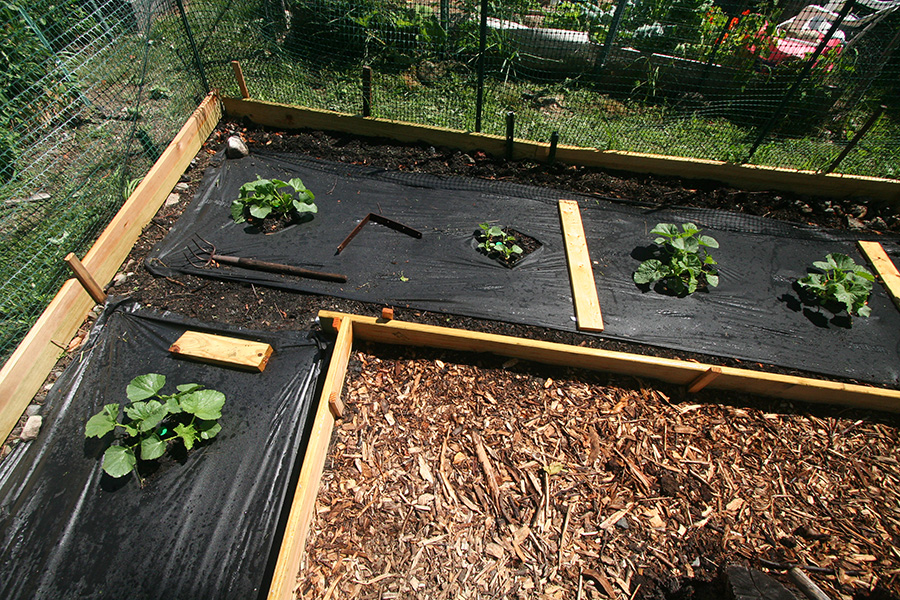 the landscape fabric prevents weeds from poking through, but that doesn't mean they're not growing underneath. these wild weeds are strong, and i could see places where they're struggling to break through the plastic fabric to no avail. eventually, starved of sunlight, they'll just die.