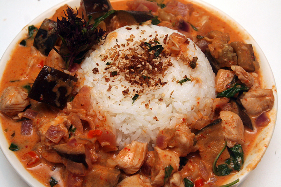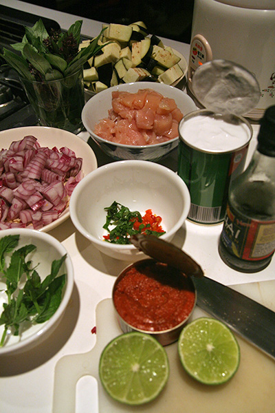 i switched to my default grocery getter bike and went to the super market. i bought some yogurt and granola mix (had some over the weekend, never ate it before, was pretty good), as well as ingredients for making thai red curry, including some chicken breast tenders and the smallest eggplant i could find (even then it seemed too big). the rest of the ingredients either i already have (curry paste, coconut milk, fish sauce) or could harvest from my garden (spearmint, thai basil).