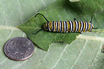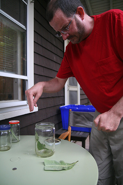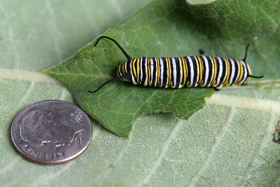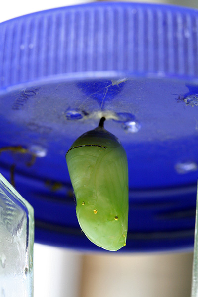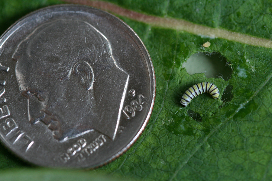 i went over to bruce's place in the early afternoon to check out his monarch farm. he's raising 3 monarch caterpillars this season, in various stages of development. there's already one in a chrysalis, a 4th instar (white dots on prolegs), and a 1st/2nd instar.