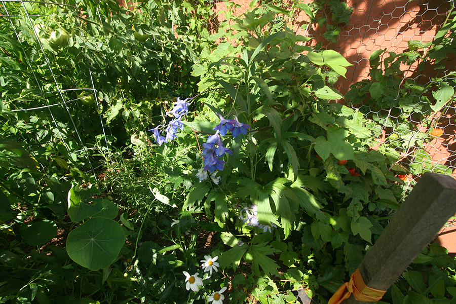the acorn squash has pretty much taken over the garden. it's even crossed over from the squash side of my plot into the flower garden. it's gotten so bad that it's almost impossible to get into my plot now. this late in the season the threat of squash vine borers are mostly gone. i haven't seen eggs in weeks (although i haven't really been checking either) and those that do hatch, even if they hollow out a stem, that isn't enough to kill the plant, which are increasing so rapidly they can outgrow any damages.