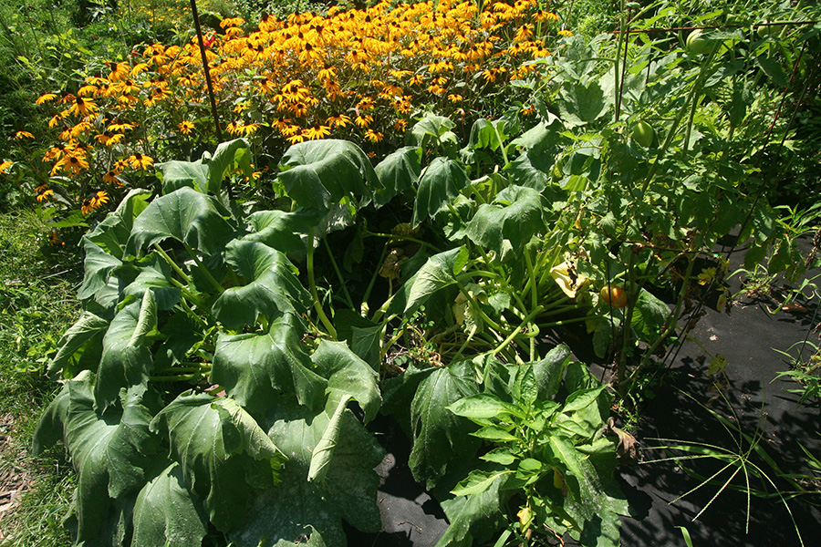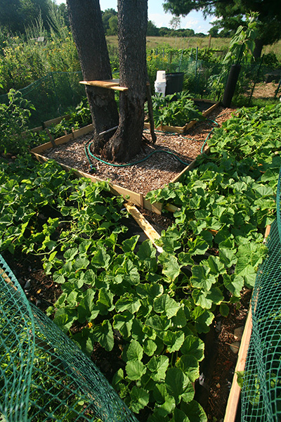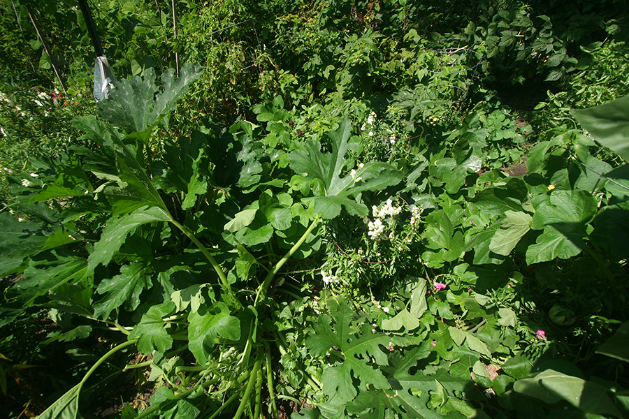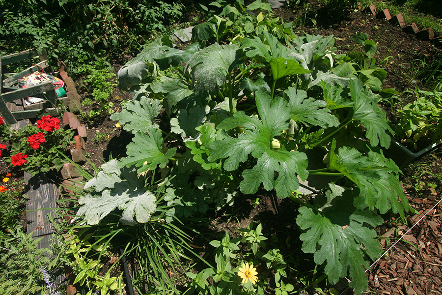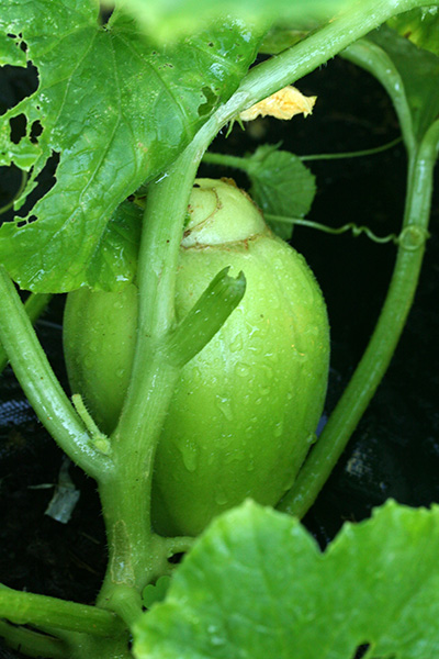 * looks like bacterial wilt (spread by cucumber beetles) has infected some korean melons and cucumbers (there is no treatment, prognosis is death) * doesn't seem to affect the squashes, which are more prone to powdery mildew (although the acorn squashes seem to have better resistance):