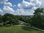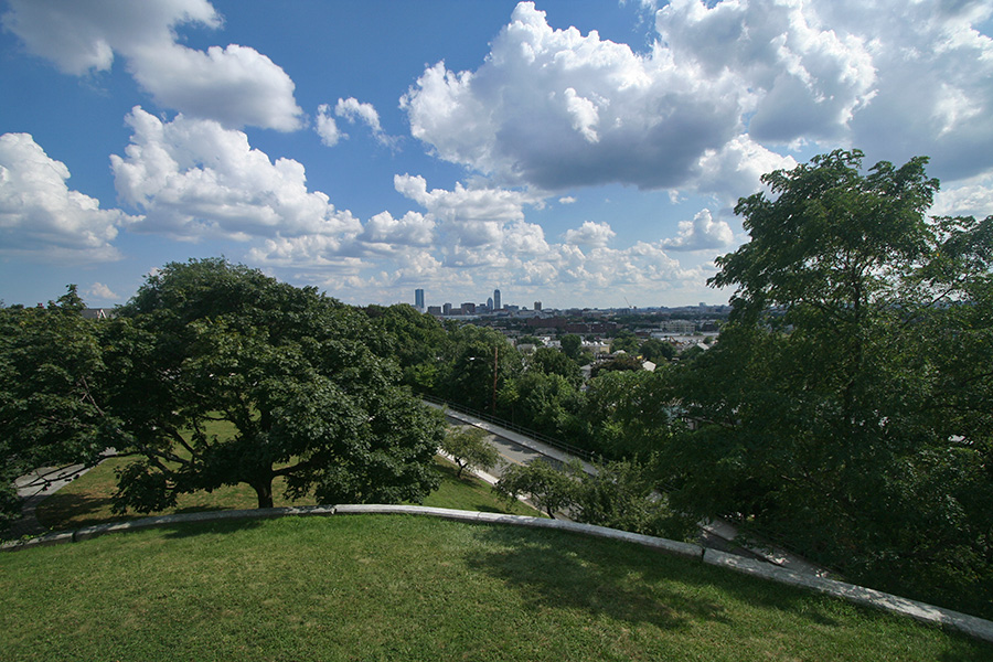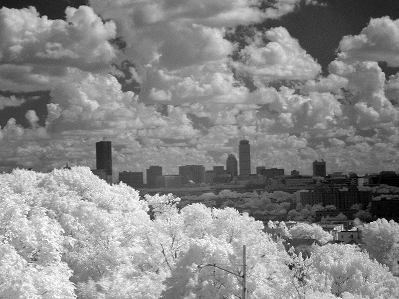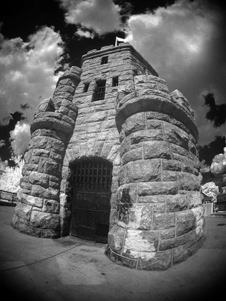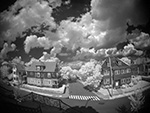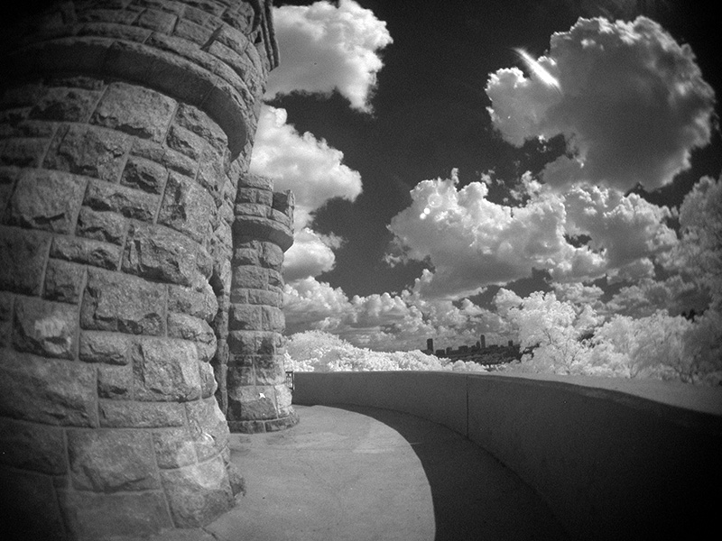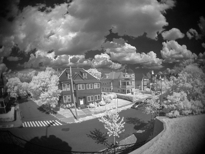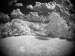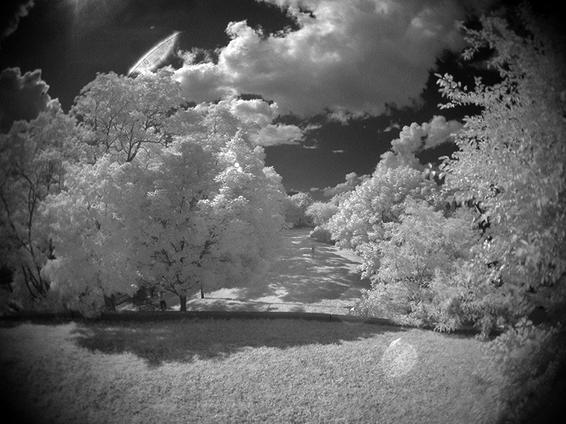 i happened to need to go to the supermarket so i brought along my nikon coolpix 4500 infrared fisheye lens setup. i rode to prospect hill park first, which is where i always go when i need a panoramic view of the sky and the horizon. everything works as expected. considering the 10mm setting (17mm equivalent) on my wide angle zoom lens only gets about 97° field of view (FOV), the fisheye is even wider with a nearly 180° FOV. the only downside is the very noticeable fisheye distortion, but it's probably impossible to fit so much image into a photo without some sort of warping. i did notice some strange lens flares; i wonder if that has anything to do with the fact that the shallow front thread of the filter that prevents my fisheye lens from threading all the way down.