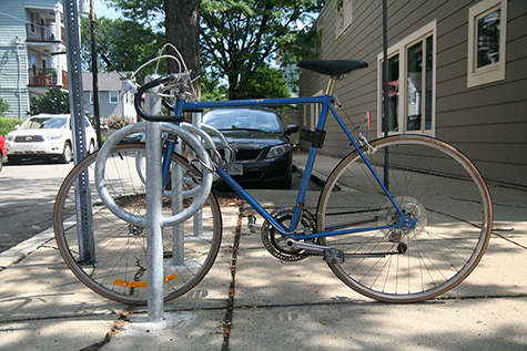 after some yogurt granola for breakfast,1 i biked down to the cafe to retrieve pau's busted bicycle. i saw it parked outside the concord avenue branch library (which meant it didn't get stolen despite the flimsy combination cable lock). after parking my own bike by the cafe, i walked down to the library. as described, the rear wheel was seized up. it seemed to be slightly off its axle and needed to be readjusted. the bike couldn't be rolled so i carried it to the cafe. while about to load it into the back of the car, that's when i noticed several rear spokes had snapped in half. that could've caused the wheel to lose it's alignment, suddenly everything made sense.