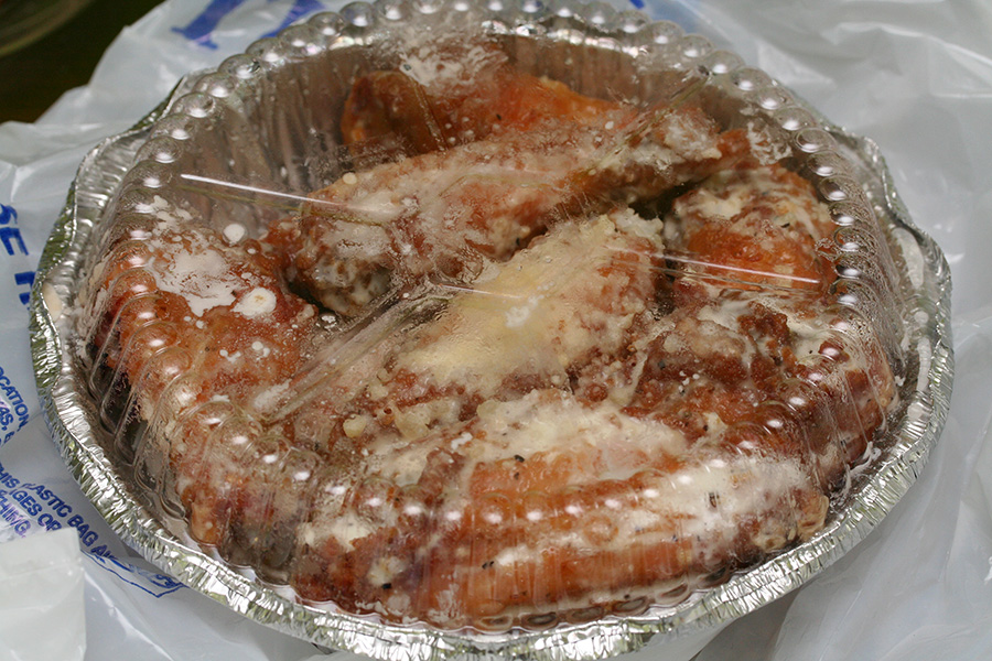 i got the 10 piece garlic and parmesan (gourmet, $8.99). instead of the usual styrofoam container, they came in a round aluminum pan with a plastic lid. i was afraid the new container meant smaller wings, but they were just as big as before (not mess with a winning formula). in hindsight, garlic and parmesan might not have been the best idea, with me traveling tomorrow. 10 pieces also seemed a bit too much as i was already full by the 7th wing.