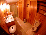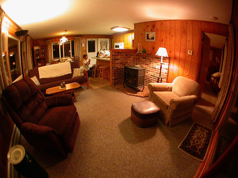 the cabin was pretty cool, situated on a peak of a hill with a view of somes sound just a few hundred yards away. but since it was pitch dark (with a heavy rain storm later in the evening) it was hard to see until sunrise tomorrow morning. known as the "command post," amenities include: washer/dryer, flat-top electric range, gas-powered cast-iron fireplace, propane barbecue (out on deck), satellite television, and wireless internet (farpoint starter so the bare minimum at less than 1 Mbsp but surfable).