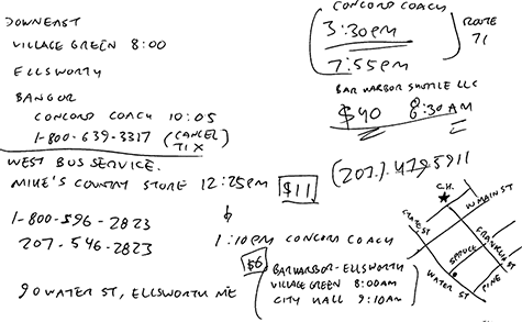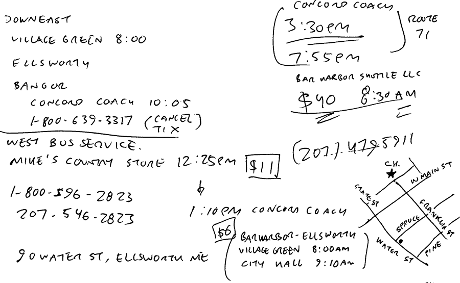 to summarize: last night i discovered to my horror that the downeast bus i planned on taking 8:00 wednesday morning from bar harbor to bangor (where i'd take another bus - concord coach - back to boston) only operated on mondays and fridays, not monday through friday as i originally thought. the distance to bangor isn't that far (49 miles) but definitely far enough (2:30 hours round trip, half of which on small local roads) that it wouldn't be feasible for john to drive me there.