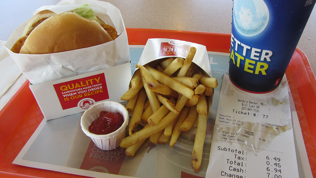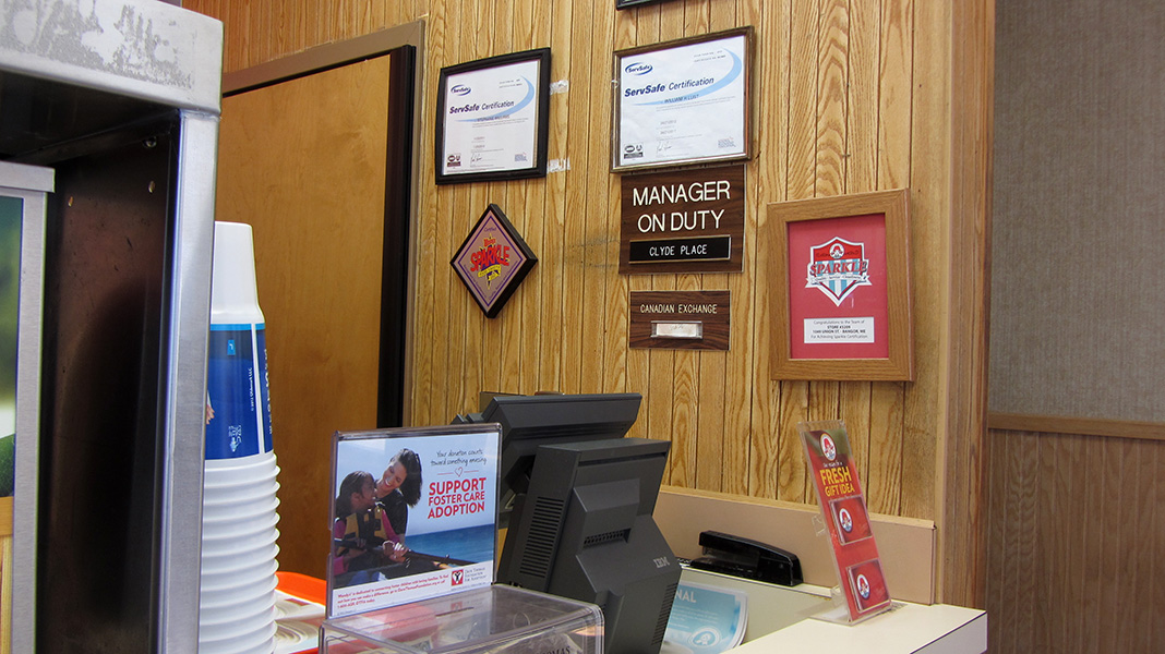 i asked one of the workers (who turned out to be clyde, the manager) when would they stop serving breakfast foods. "we don't have a breakfast menu," he informed me to my embarrassment. i got confused because familiar items were switched around, like the spicy chicken combo wasn't the usual no.6 but rather newly-designated no.7. i also noticed a canadian exchange rate sign; apparently they take canadian dollars as well.