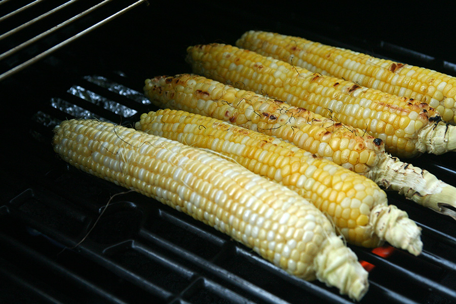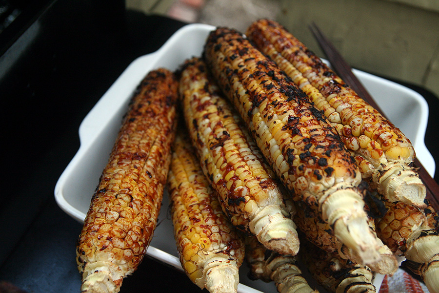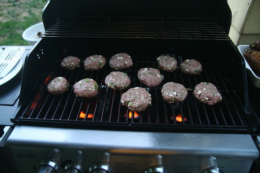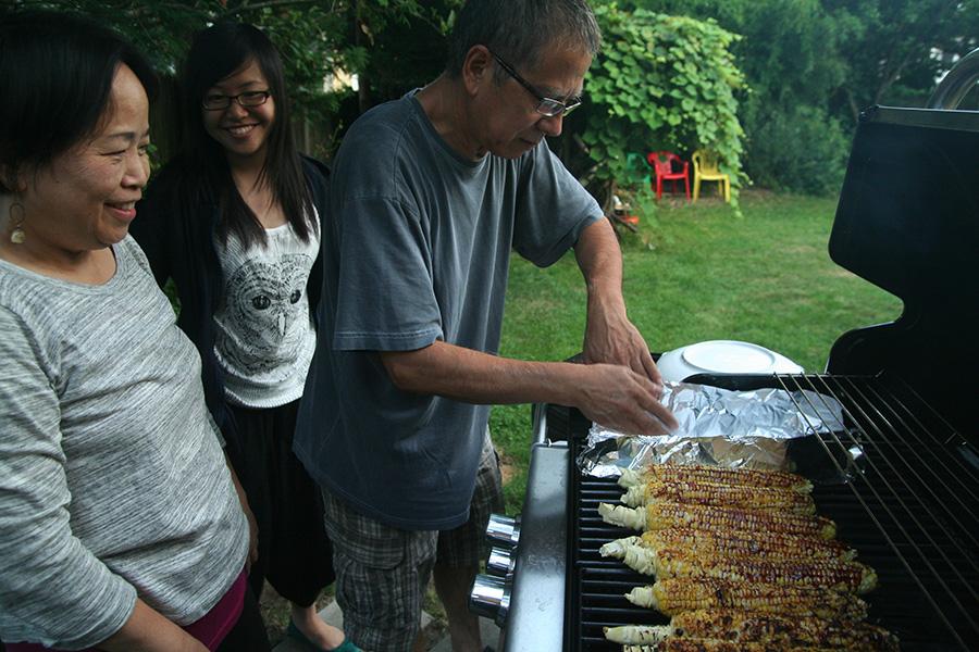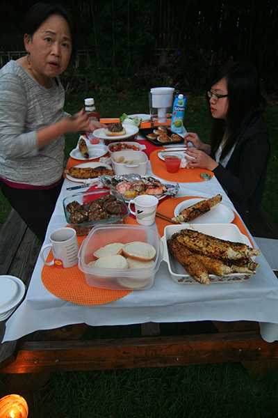 we had barbecued corn and blue cheese burgers (my sister wasn't home for dinner). i tried smoking with some hickory chips for the first time. it's not bad, but definitely a stronger smoke flavor; i prefer the mellow sweetness of mesquite. tangtang was impressed by the size of our barbecue; in taiwan most people use a simple hibachi. my parents grilled some salmon steaks, one of tangtang's favorites. she was awed by the proportions, since normally they're thin-sliced in taiwan. when the burgers were ready, tangtang was astonished by how delicious the beef was, different than taiwanese beef (imported from australia). one thing i noticed was she never takes any photos.