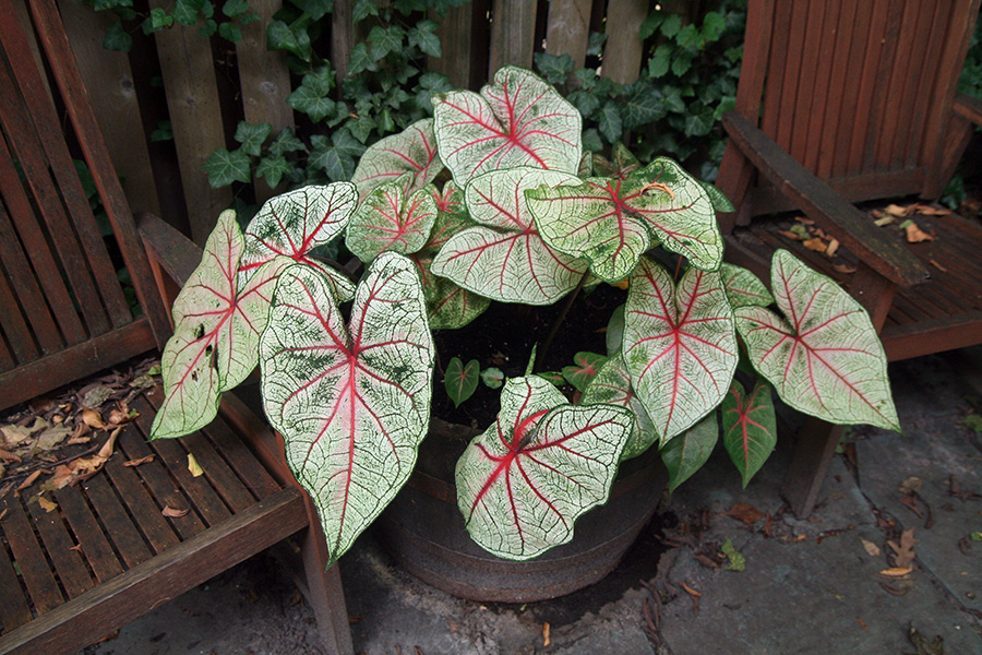 while the back caladiums are more white (which is what they're supposed to look like). i think it's because the front caladiums actually get a few hours of direct sunlight in the early morning, which changes their color; the ones in the back are always in the shade. caladiums are naturally shady plants.