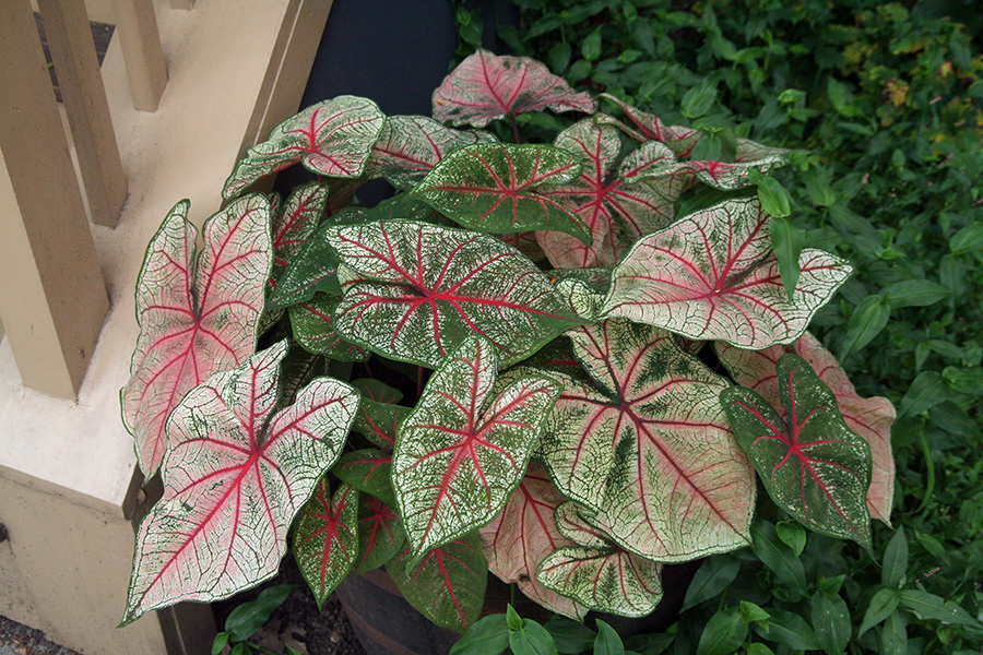 even recognize them as the same plants. even though i've planted the same variety in the front and the back, they look different: the front caladiums have more green,