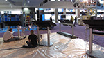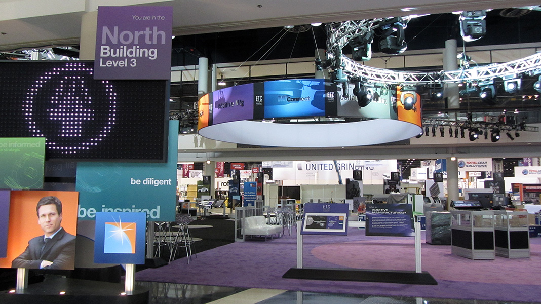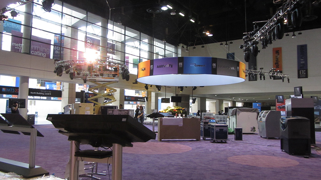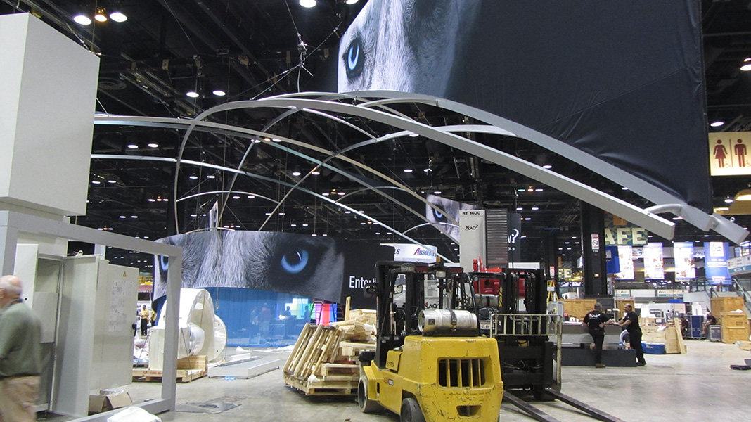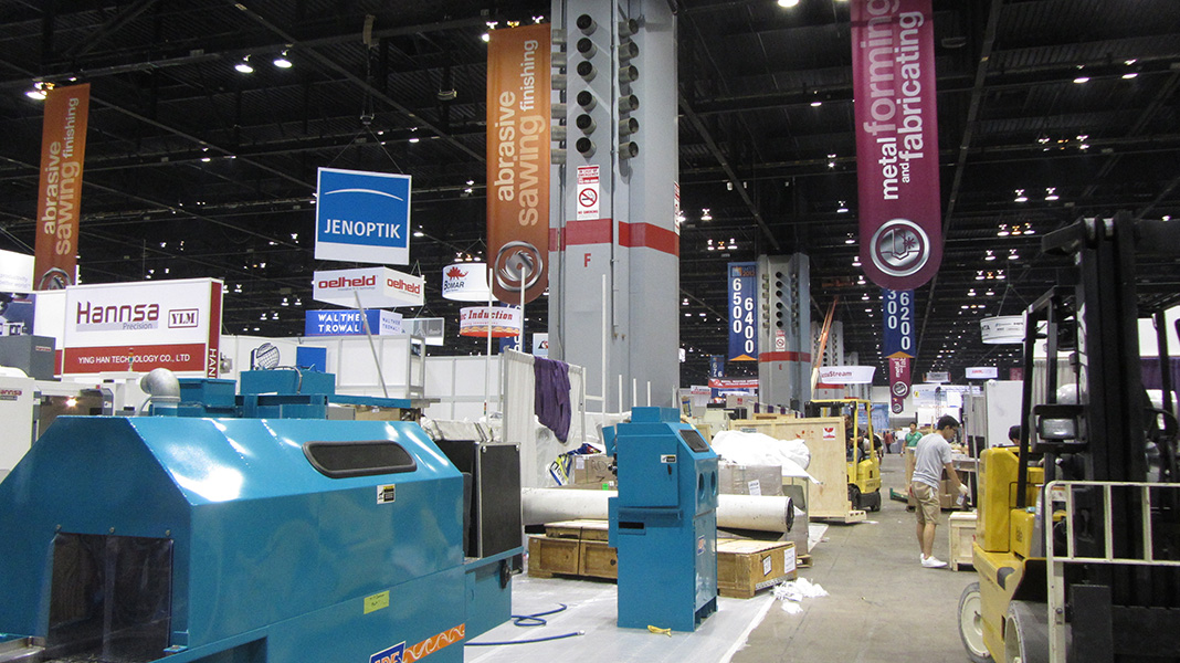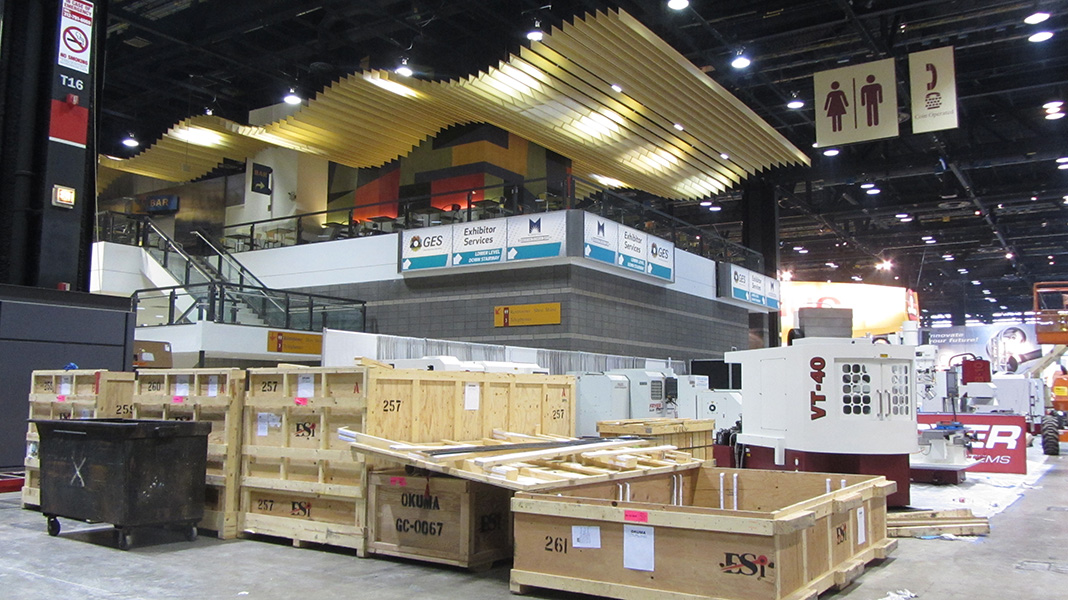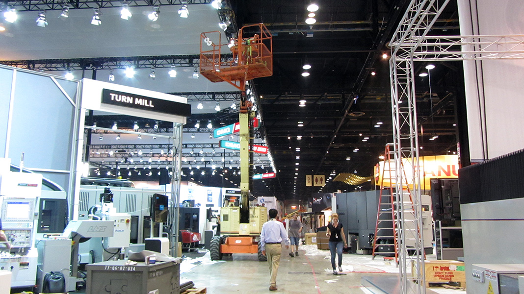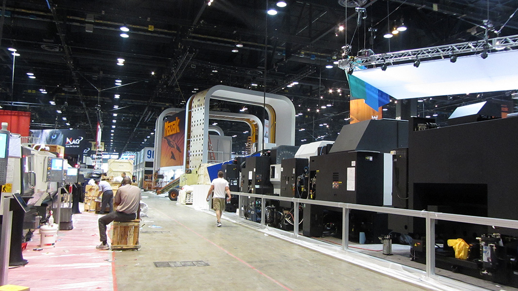 mick gave me a quick tour of the place. the event was the biennial international manufacturing technology show (IMTS), and we were doing work for the show runners themselves, setting up their main exhibit. it was held in the mccormick center, which is the largest convention space in north america. the IMTS is so large that it takes up all 4 buildings. we were setting up in the south building, but i caught a glimpse of the north building. since the show doesn't start until next week, everyone was busy setting today (so they wouldn't have to work over the weekend). at times the place seemed like a construction site, with forklifts and cranes and the beeping of carts ferrying construction guys and material. it was nothing like i'd seen before.