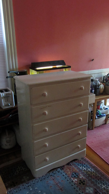 back at home, drew helped me carry the dresser inside the house. he was impressed by how nice it looked on the outside, and was surprised nobody had claimed it yet, given the high college population. unfortunately he didn't need a dresser that large since the bookshelves were good enough. that means i'll need to find a place for the dresser in the kitchen. i was thinking about retiring the guppy tank (with its population of 1 guppy, which i'd transfer to the tetra tank) and putting the dresser in that space.