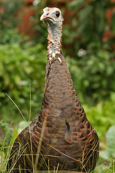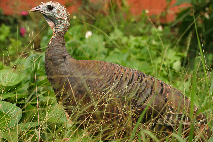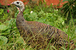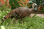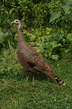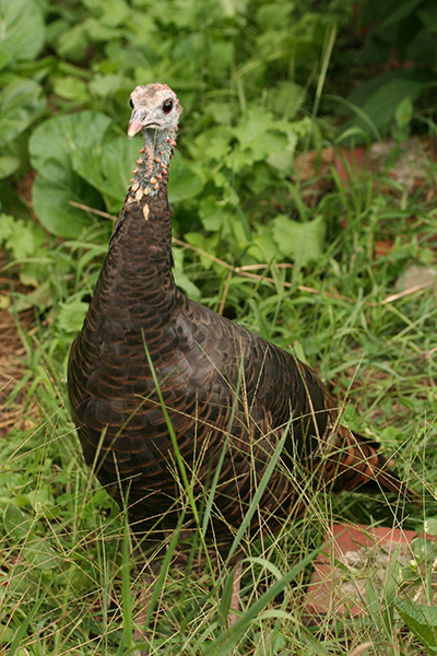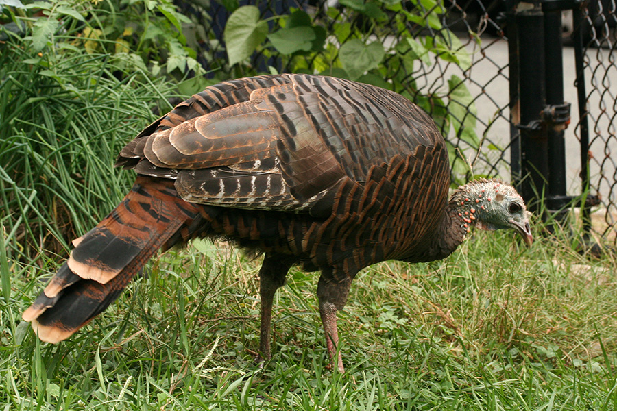 while i was leaving i came across a turkey hen feeding on the grass in front of the community garden. it wasn't startled when it saw me, but kept a watchful eye. i crouched down to make myself smaller and took a bunch of photos. it was about 2 yards away from me, the closest i've ever been to a wild turkey. a few times it stretched out its neck to make itself seem taller, and even make some cooing sounds. i'd never seen a turkey in the community garden, nor in cambridge for that matter. they're more common in the suburbs, and at my parents' place we've seen groups of turkeys on neighbors' lawn a few times.