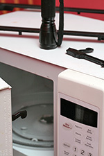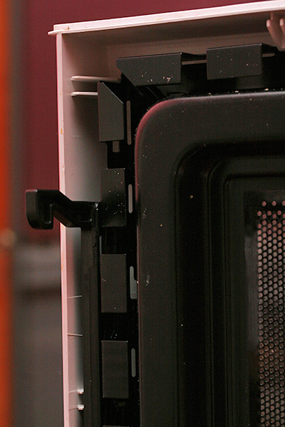 figuring before i complain to the seller i should check to see if i can still make do with the broken replacement bracket, i brought up the old microwave from the basement and pried off the plastic frame behind the door. i inspected the old bracket (that i put back after supergluing and then taping together the pieces) and saw it only needed one hook (to grab a spring) so maybe i lucked out and don't have to send the replacement back. my repair to the broken bracket is usable, but the door has a tendency to stick.