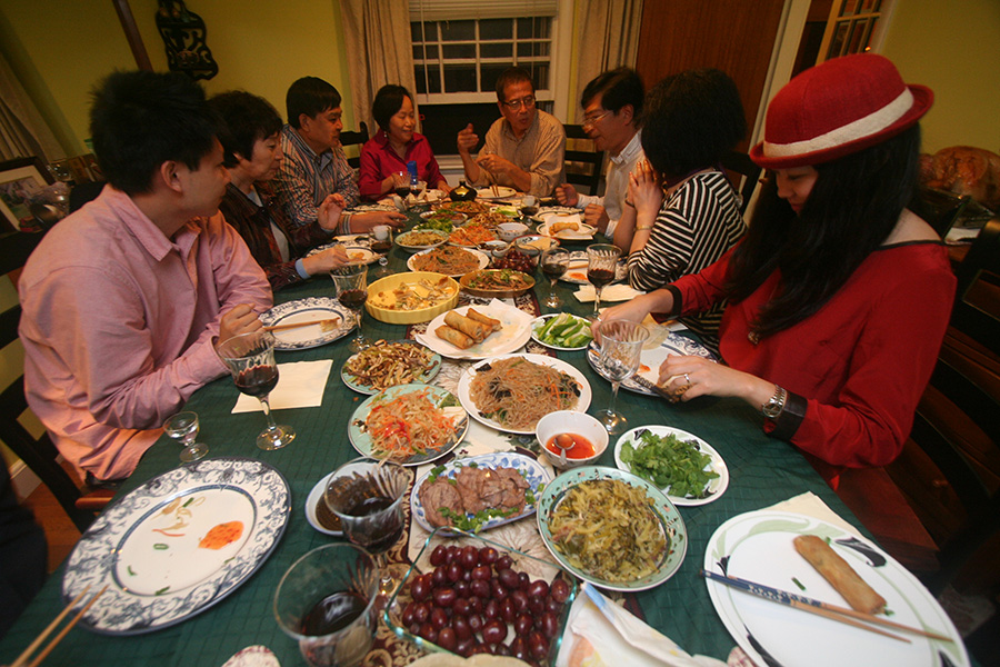 i think the seating arrangement is the most important part of a successful dinner party. within the past week we've had dinner with bin bin's extended family on 3 separate occasions, and each time i've noticed the seating arrangement hasn't been ideal. people ended up sitting next to others that they weren't entirely compatible with, resulting in awkward dining. so i had it carefully planned where bin bin's fiancé would sit next to his parents while bin bin sat with him, and then her parents sat across from her. when she then decided she wanted to sit next to her parents (which made sense) it threw the seating arrangement out of whack a little bit. my sister ended up changing seats leaving 2 empty seats for lili and matthew when they arrived later at 6:30.