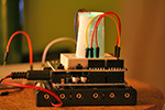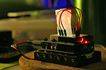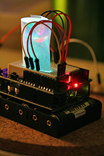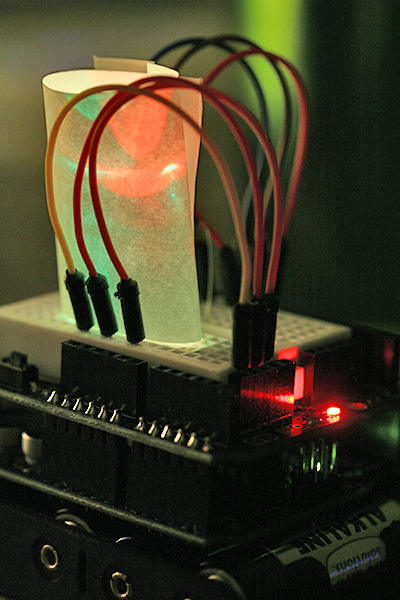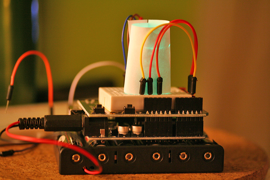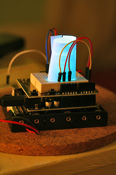 i had some free time in the evening so i tried building an arduino mood lamp. i was trying out my protoshield with the mini breadboard for the very first time. i had a hard time getting it to work: the problem was i didn't insert the protoshield pins all the way onto the arduino uno. once i did that it worked better, but not perfect. the lights don't change as smoothly, not sure if it's a hardware or software issue. something else i tried was powering the whole thing from an external battery pack. i managed to get it to work over the weekend (have to jiggle the batteries a little bit). the final creation looked like a heavy electronic tank with a color-changing paper tube chimney on the top.