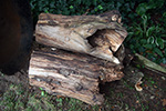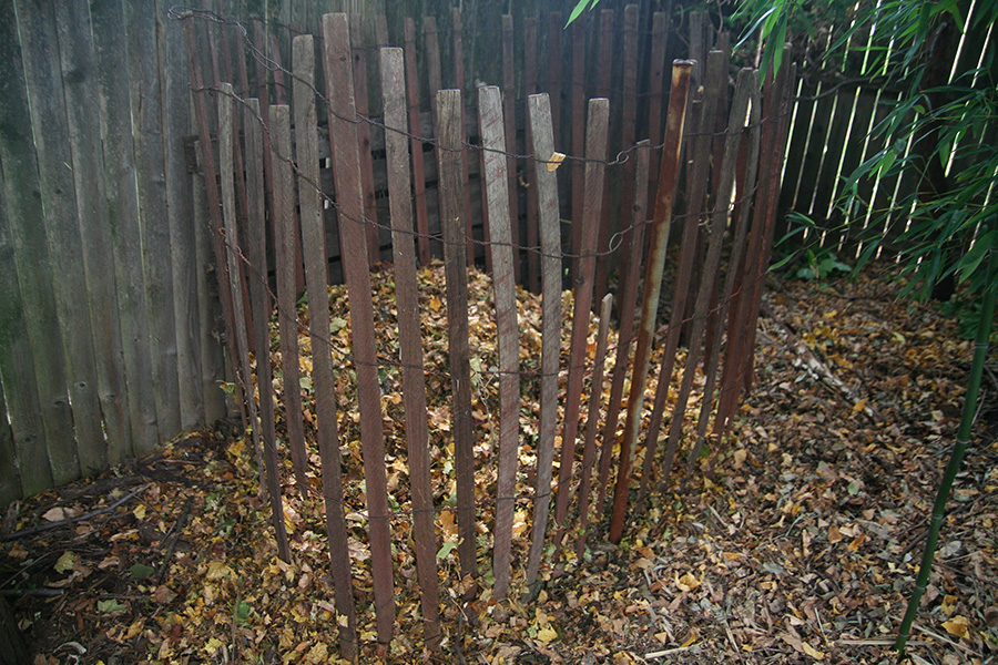 once the dead apple tree was removed, we chopped it up into several pieces. i want to save the wood for future smoking purposes. in the place that formerly was the apple tree, we erected a simple large compost bin using a coil of wooded fencing wire. all the leaves and grass that my father mowed we dumped into the newly constructed bin. autumn mower debris makes the best compost because it already has a good mixture of green and brown ingredients.