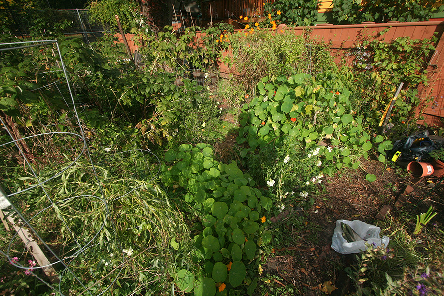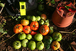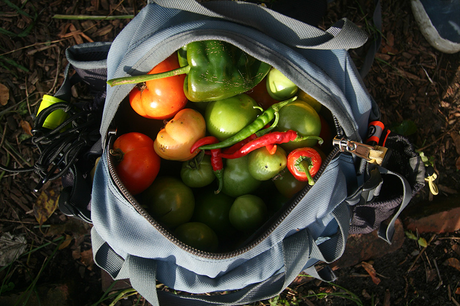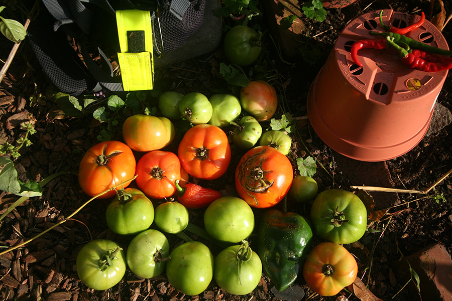 later i visited my community garden plot to do some more cleanup. i was really there to harvest any remaining vegetables. i came too late, because there were a few red tomatoes rotting on the ground, but there was still enough red and green tomatoes on the vine to pick. i also collected some hot peppers. afterwards i pulled up all the tomato plants.