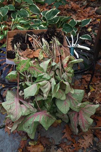 in the afternoon i finally dug up the caladiums growing in the 2 wine cask planters. i should've done it earlier, before the weather turned cold (caladiums are tropical, they don't like temperature below 55°F). some of the tubers seemed to be dead, soggy and crumbly, while others looked like they might survive into next season. i set them out to dry in the basement. i also raked all the oak leaves in the backyard as well.