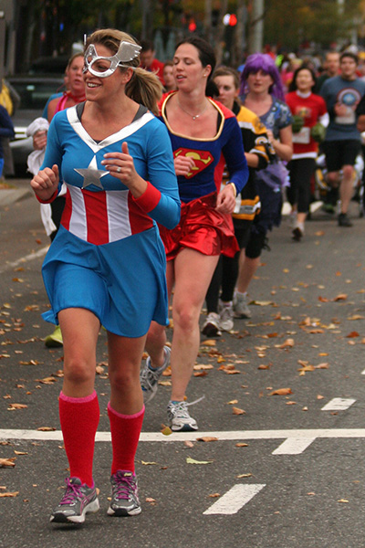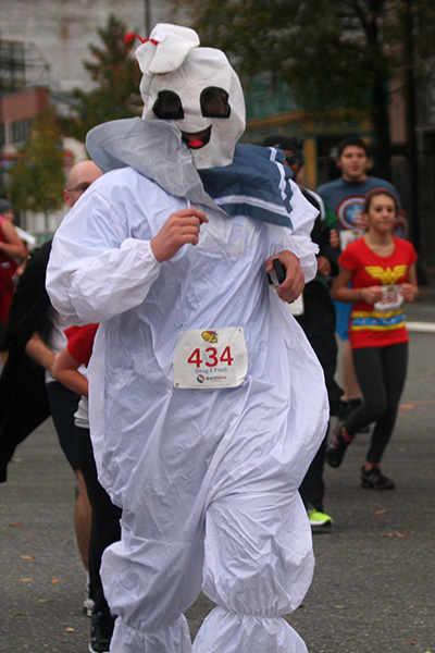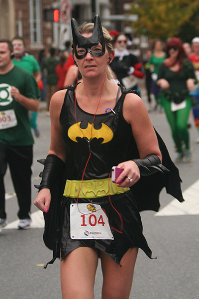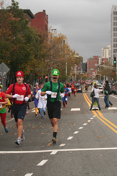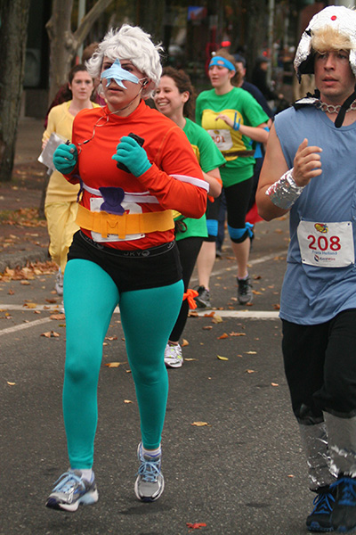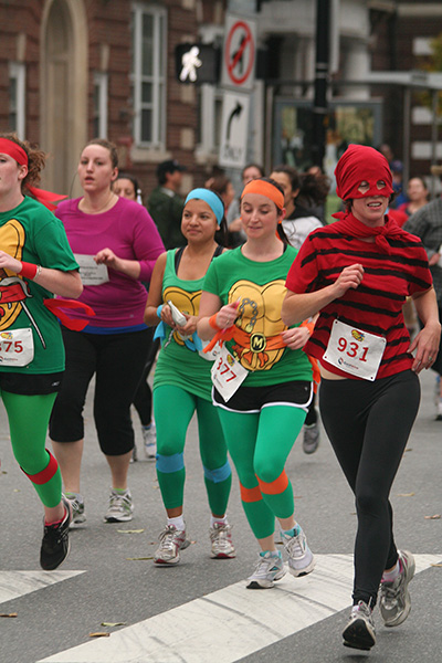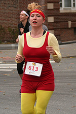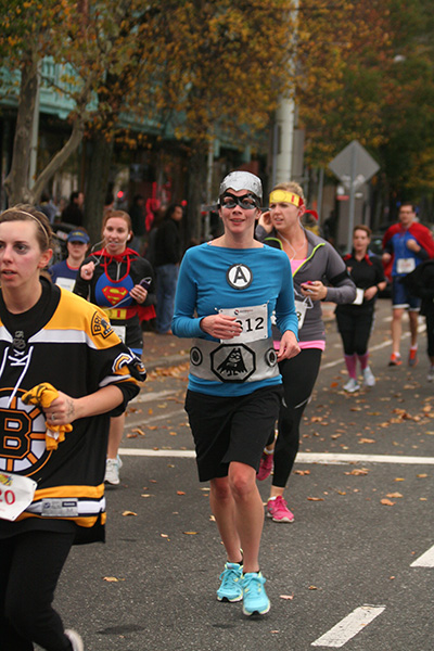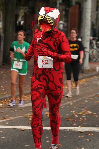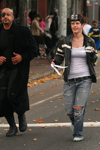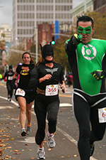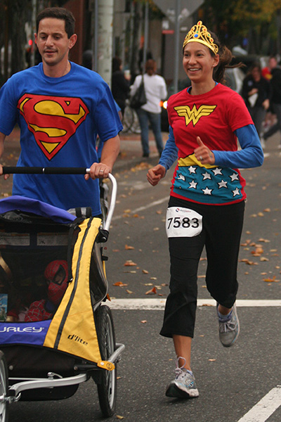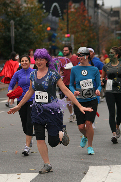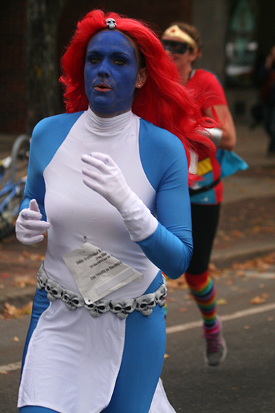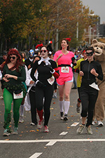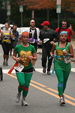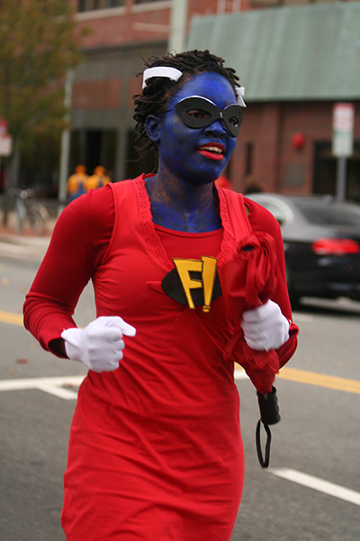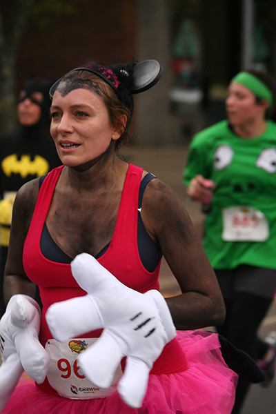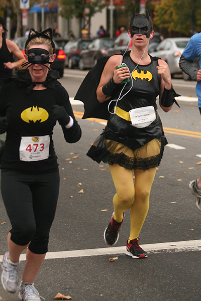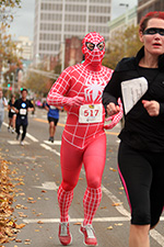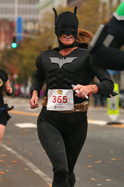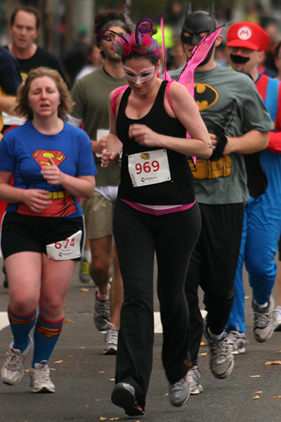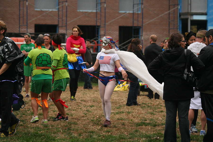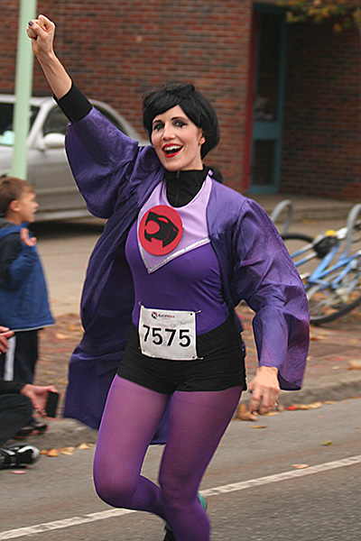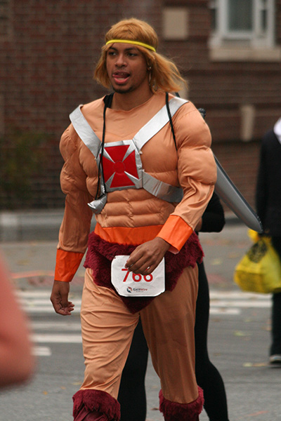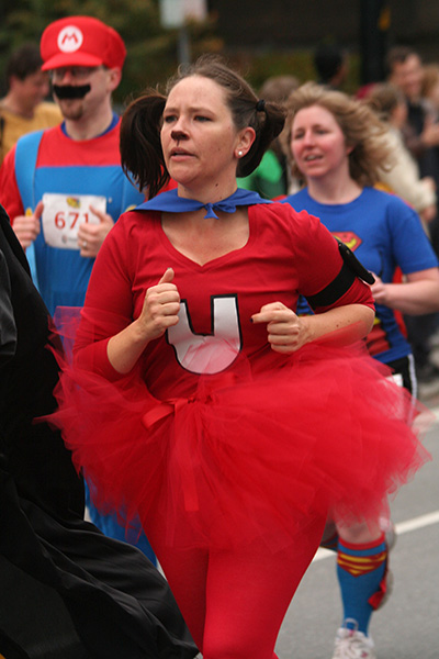 it's pretty interesting and there was so much to see that i used up my 4GB memory card without even realizing it (approximately 1000 photos). the amount of creativity is pretty amazing. i wonder if some of the outfits were actual halloween party outfits retrofitted as running gear? plus it helps that there were cash prizes for best individual and group costumes (i wonder who won? couldn't find a list online). it's no new york city halloween parade (2008, 2010), but i don't have to travel 250 miles to see it, and it takes place during the daytime (a little easier to photograph than at night).