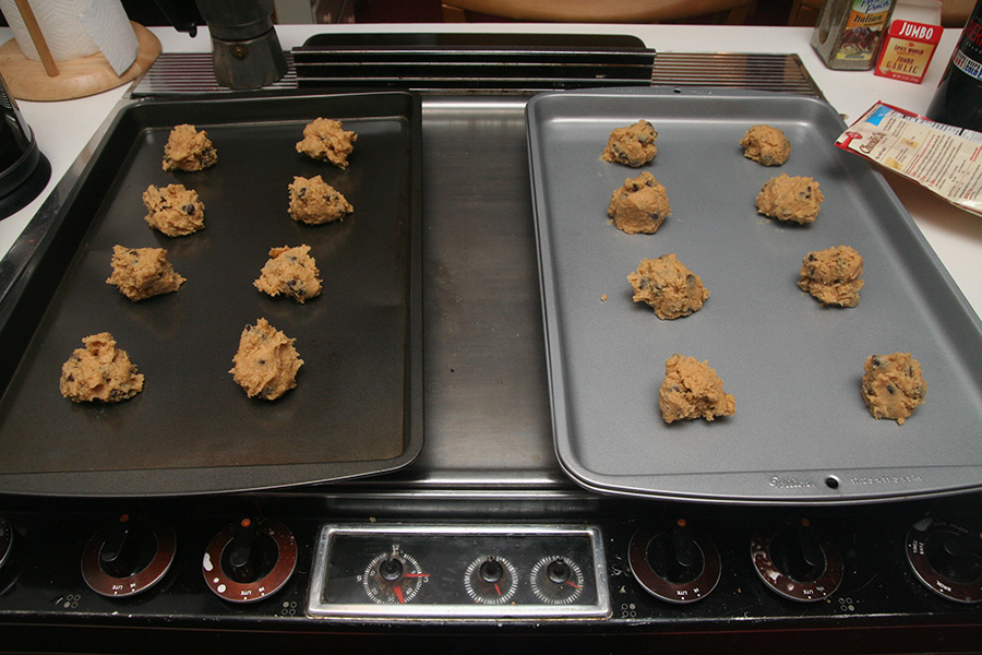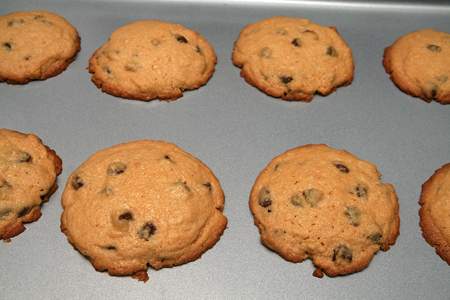i baked the cookies in 2 batches: the first batch i probably took them out too early (10 minutes) because they were too soft; the second batch was much after after i gave them a few extra minutes to get crispy.