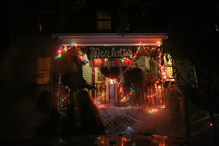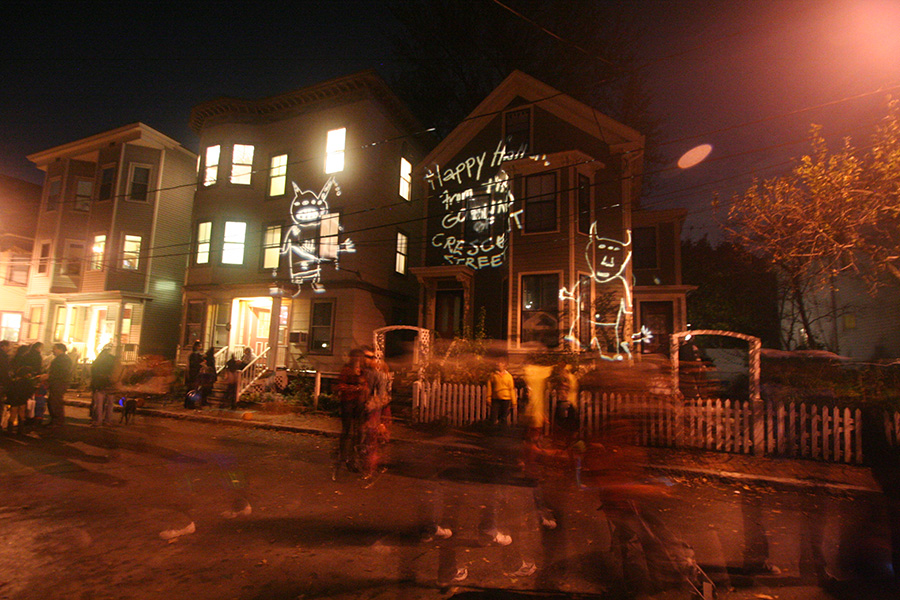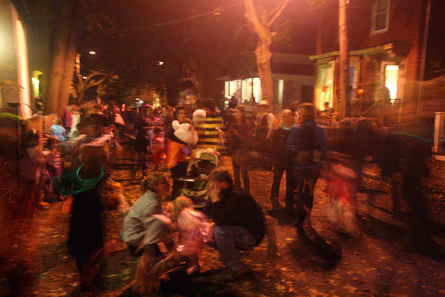 at 7:00 i took drew out to go see the halloween happenings on traymore and crescent street. normally i wouldn't go because it's kind of suspicious seeing a single man taking photos around kids, but drew was my beard. i saw a lot of neighbors, including ed, joel, and jen.