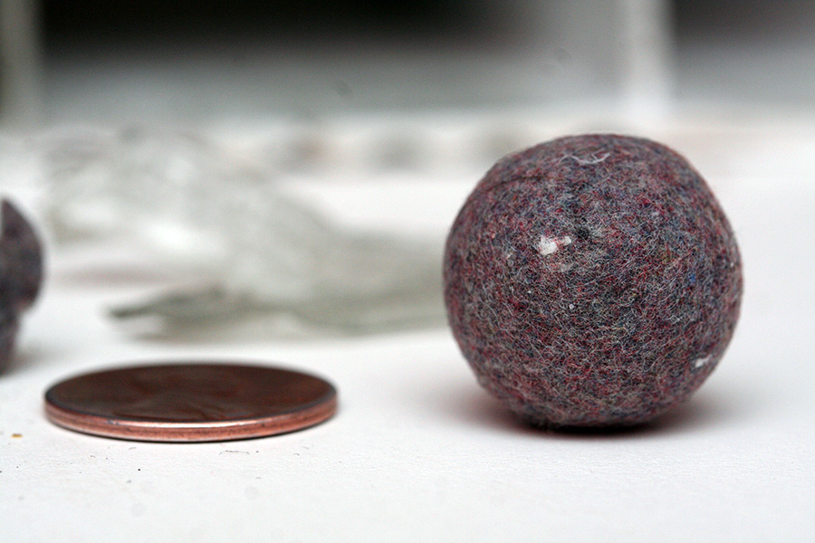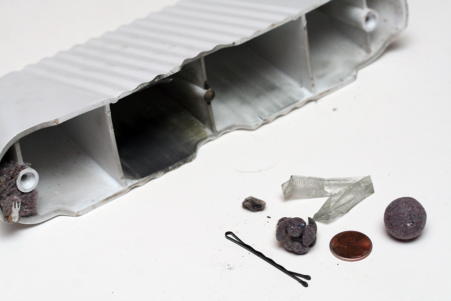 but since i had the dryer disassembled, it wouldn't hurt to go that extra mile and inspect the baffles. when i run my dryer i always hear the sound of loose change clattering around inside. i never knew what it was but not realized it was coins trapped inside the baffles. so i removed the baffles one at a time to see what was inside. there was all sorts of things, from plastic wrappers, to hairpins, to pieces of lint, to well-worn coins. i also found one of the most surprisingly beautiful things: a perfectly spherical lint ball. 2 of the baffles had coins, while a third only contained lint.