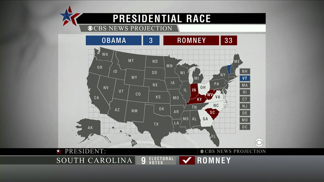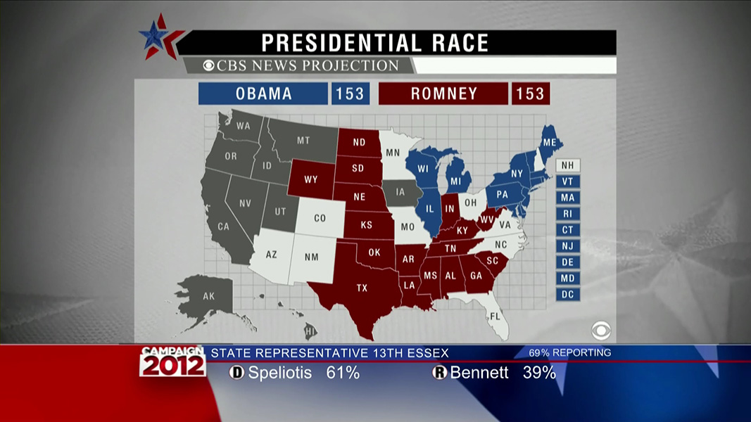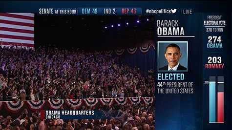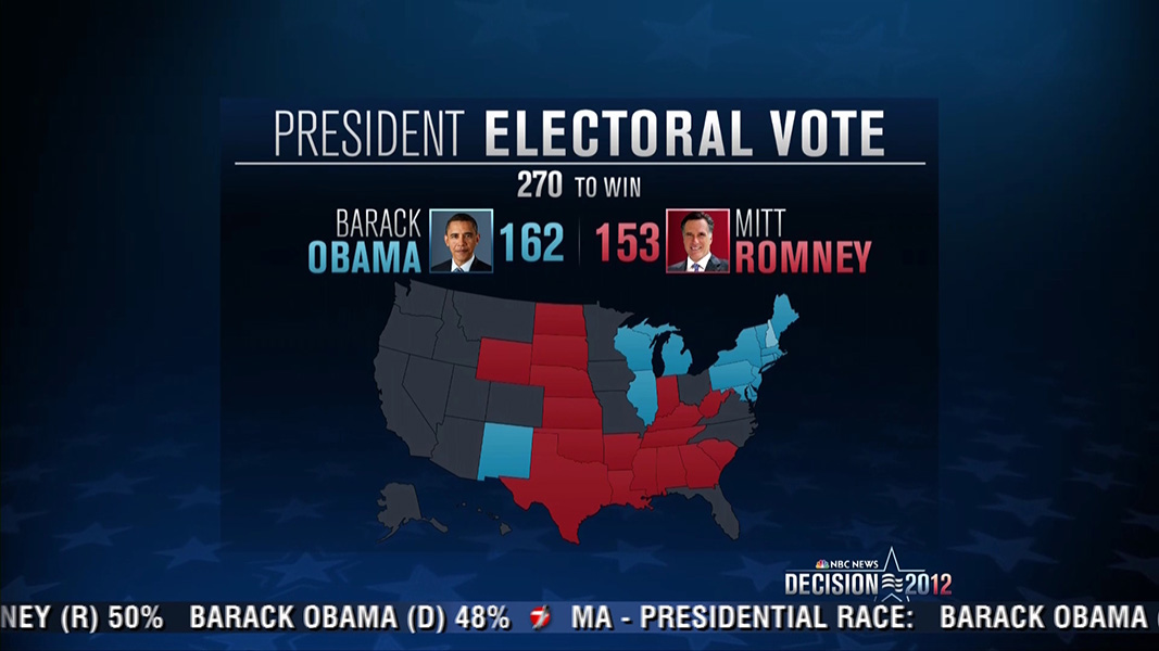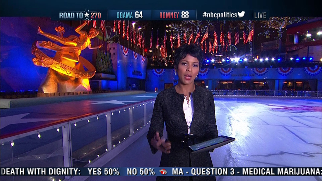 my broadcast of choice was MSNBC, but the coverage just isn't the same, not since they broke up the 2008 team. norah o'donnell was now with CBS, and who knows where contessa brewer is (she was my favorite). of the national broadcasts, CBS had the cleanest election graphics, while ABC the messiest. ABC also had the committee of pundits, just like CNN, while CBS went with the more subdued 3-person anchor team. NBC had the most gimmicks, with their interactive electoral college board manned by chuck todd (confusing as hell when suddenly it looks like either obama or romney had won the race, they should disclaim those segments with a "hypothetical" label), the ice map, and blue/red lit rockefeller plaza.