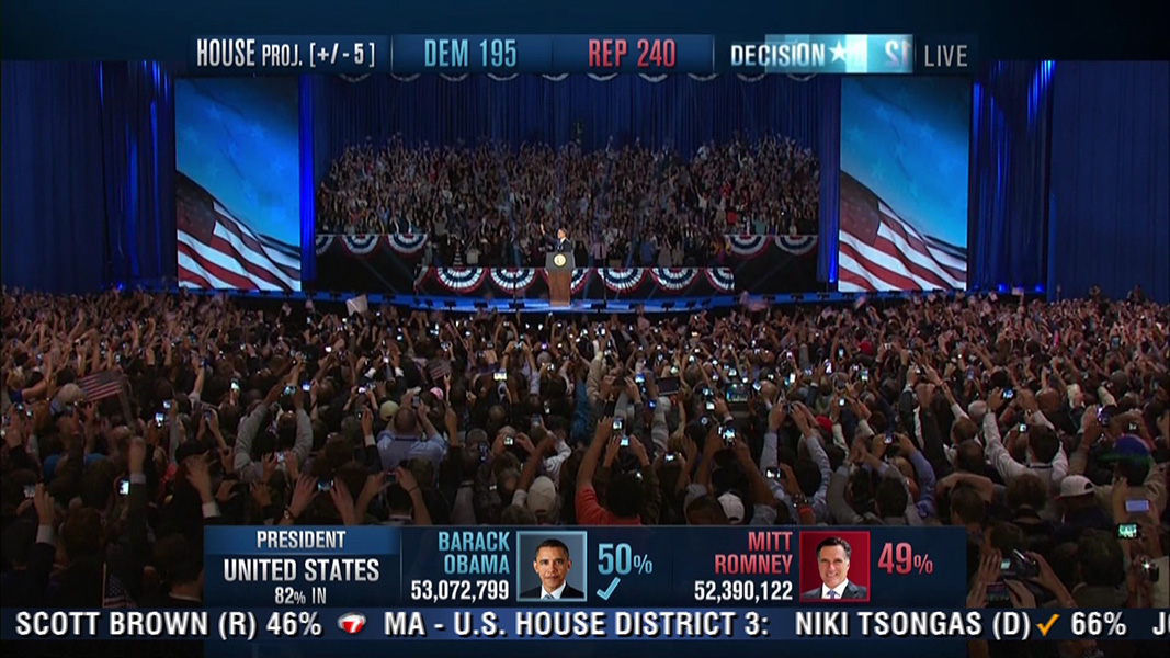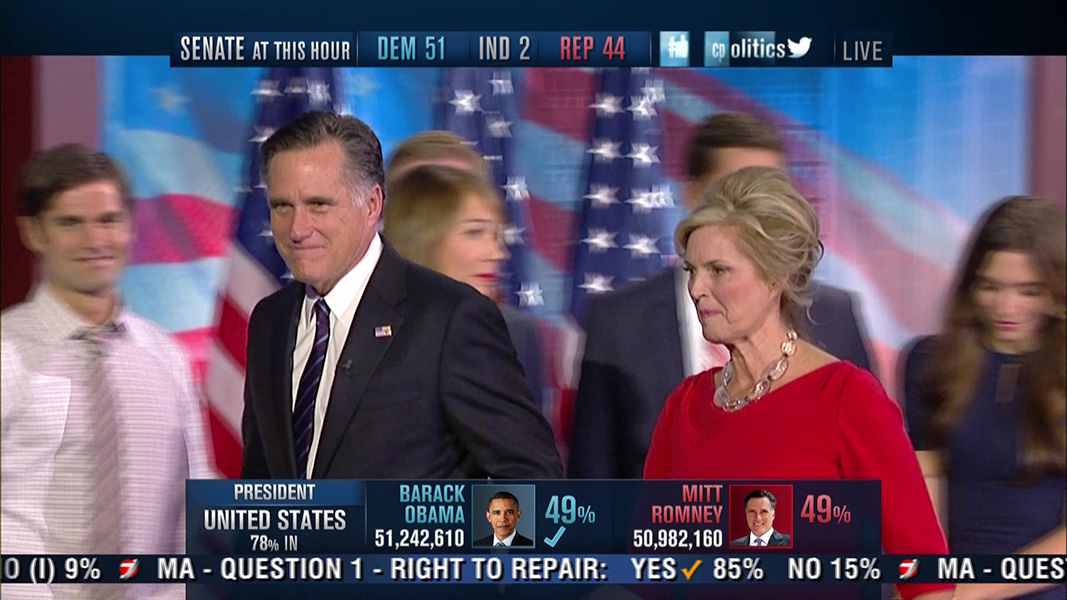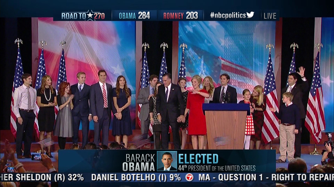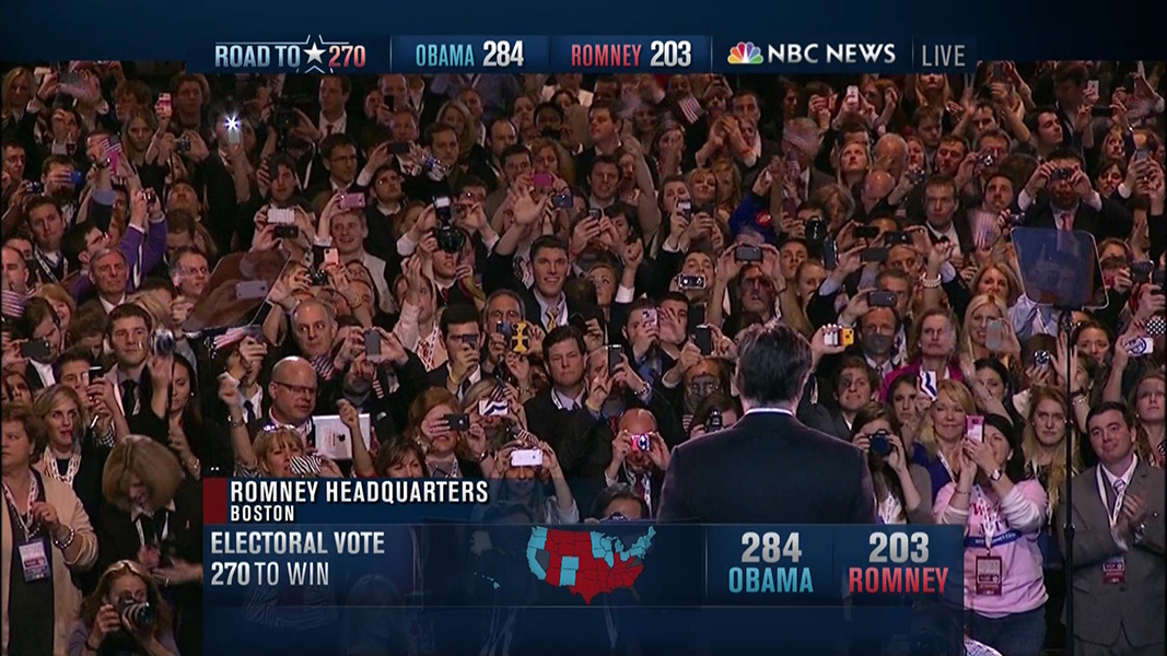 while the obama supporters were dancing and cheering, the romney supporters were stunned and silent. there was a long wait for romney's concession speech. with a race this close, they wanted to double check that what the mainstream media was reporting was true, maybe to verify with their own operatives in the battle ground states. rumor has it that romney was so sure he would win, he didn't even write a concession speech, and was spending the time to quickly draft one up. as sad as it was for him and his supporters, i still don't feel too bad for romney, being that at the end of the day he still has more money than the average american can hope to earn in their lifetime.