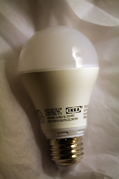 i spent some time playing around with the new LED light bulb. i was surprised by how bright it was, but it's only rated at 400 lumens, while the CFL bulbs i have in my lamps are 900 lumens. eletricity-wise, i'm not saving that much either: the LED uses 8.5 watts while the CFL uses 13 watts. then what's the advantage of LED bulbs anyway? supposedly they last much longer (as long as 20 years!) but they cost 3-4x more than a CFL. LED bulbs turn on right away (no delay), they don't get as hot, and they don't contain any mercury. i don't think we're there yet with LED bulb technology, but we're getting close.