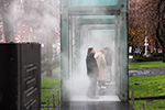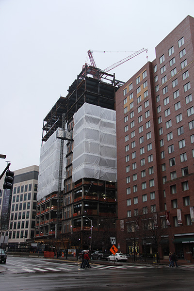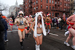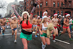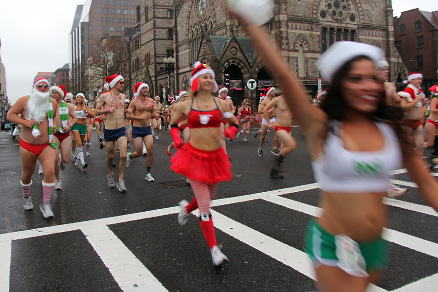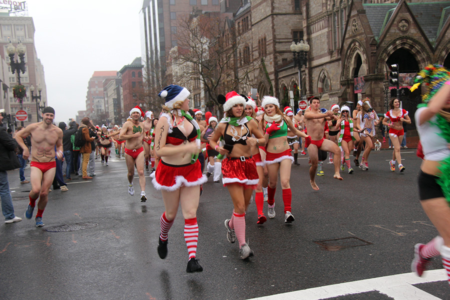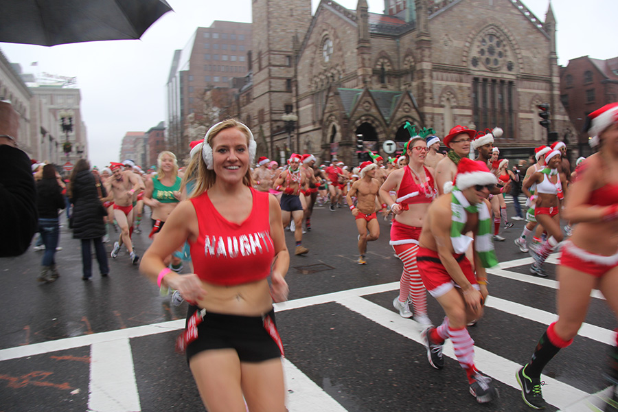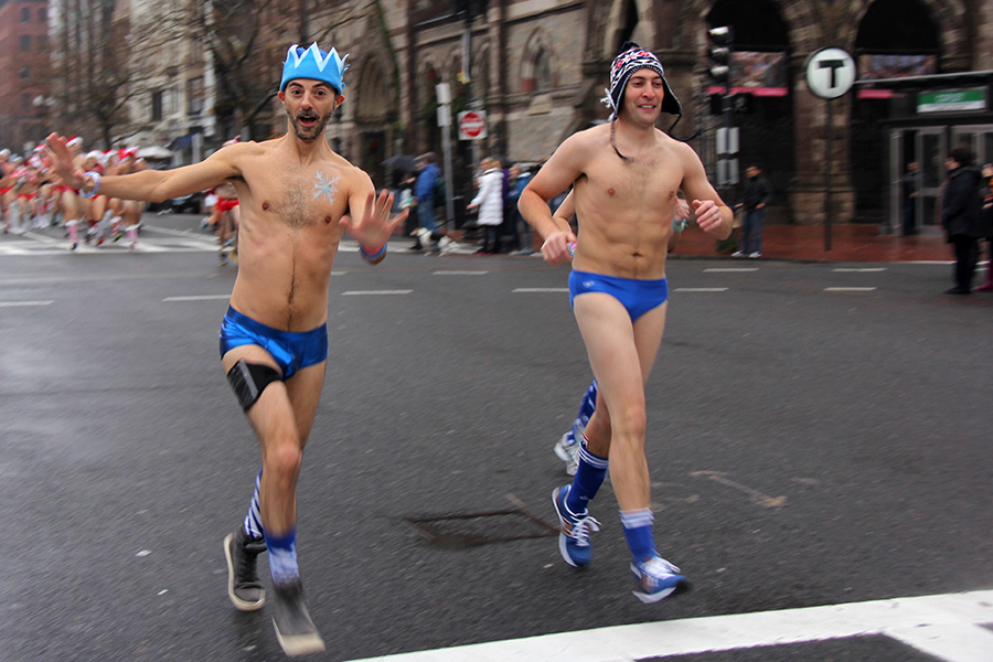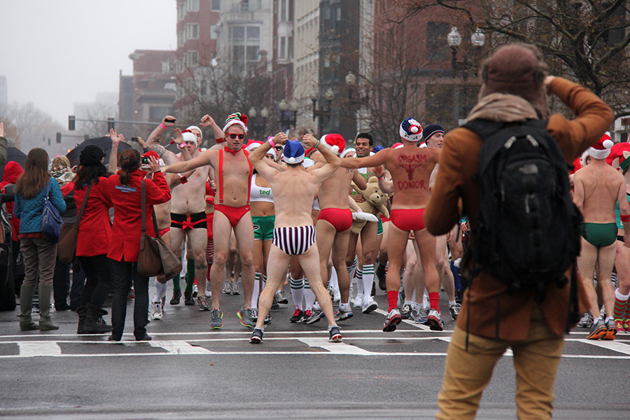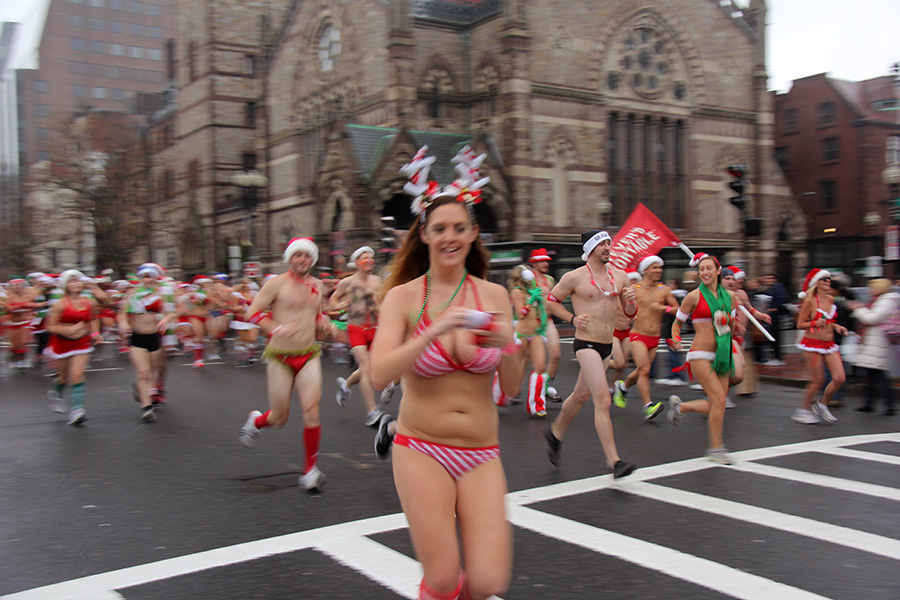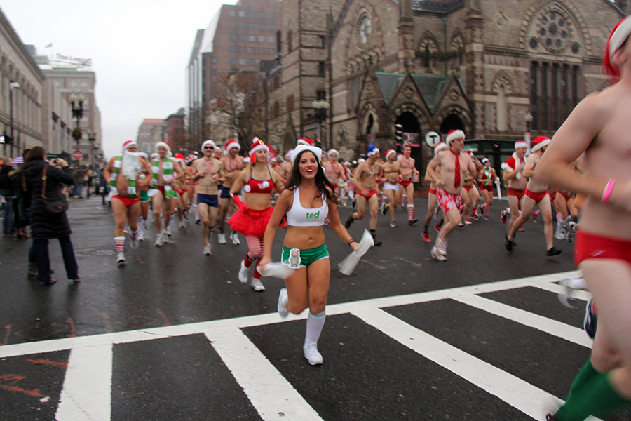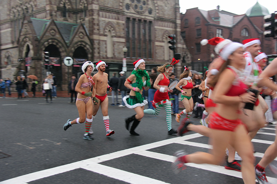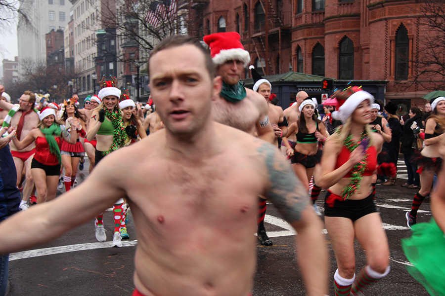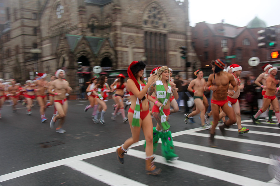 it was an exciting day, because for the first time i'd get to use my new camera and new lens for one of the reasons why i originally got it for, and that is to take parade/event photos. the annual boston santa speedo run was upon us, the last spectacle of the year. the sky was grey which is great for leveling out overblown highlights, but it was also foggy and misty, so water kept getting on the lens. i left the house around 12:15 and arrived in copley square around 12:45, standing on my favorite street corner.