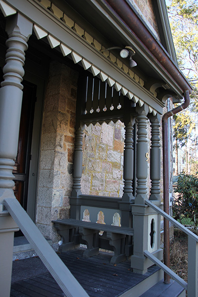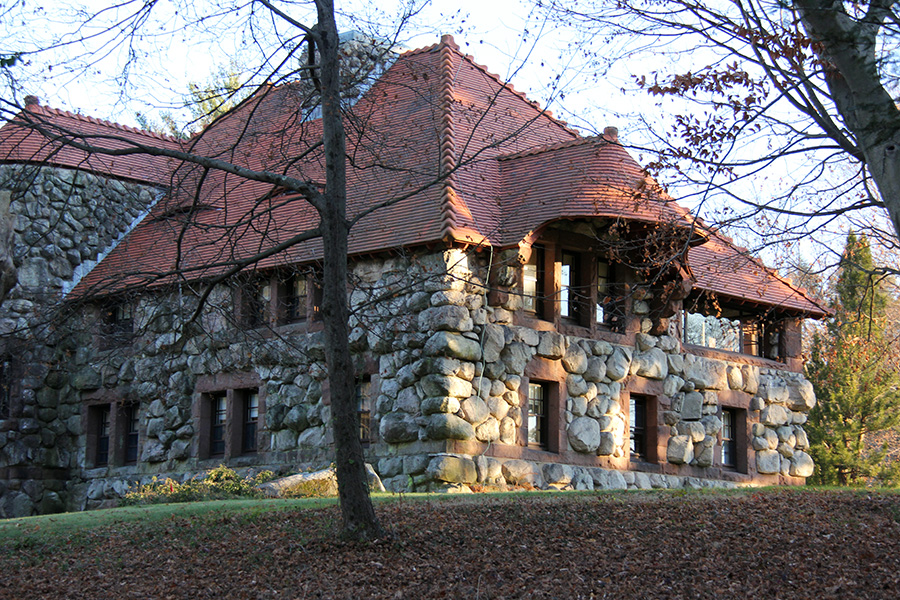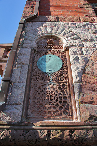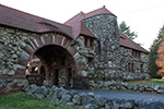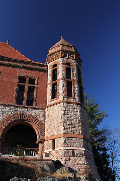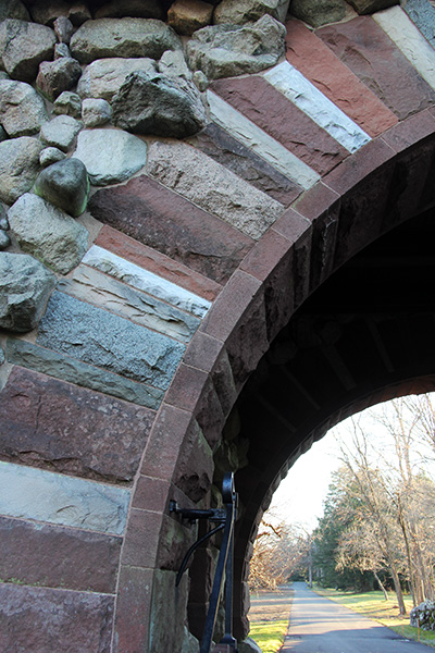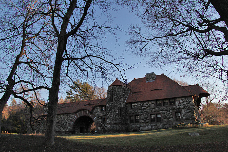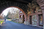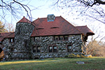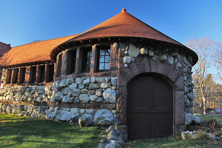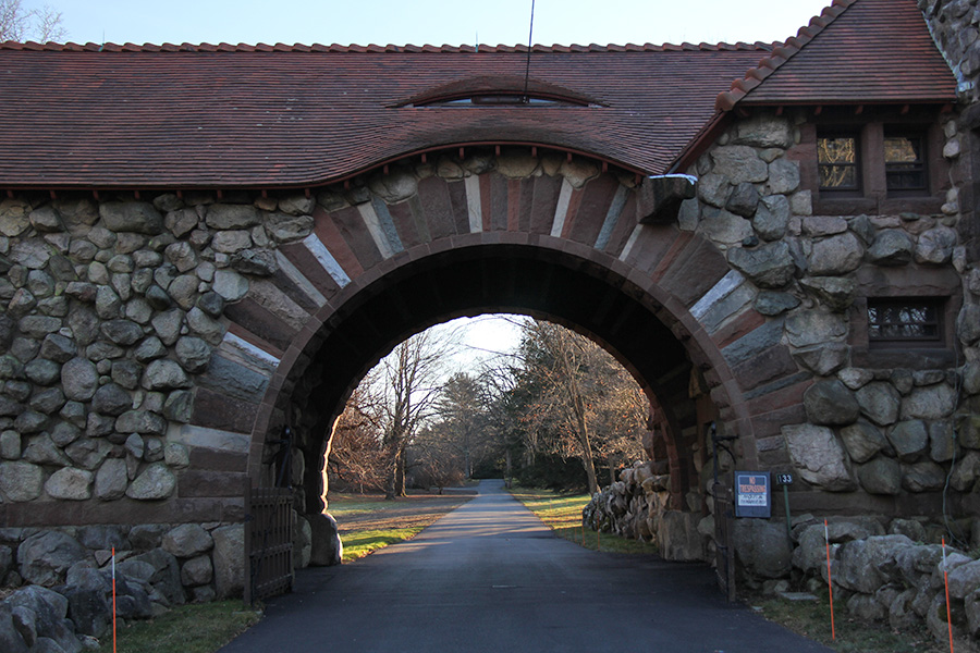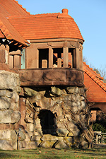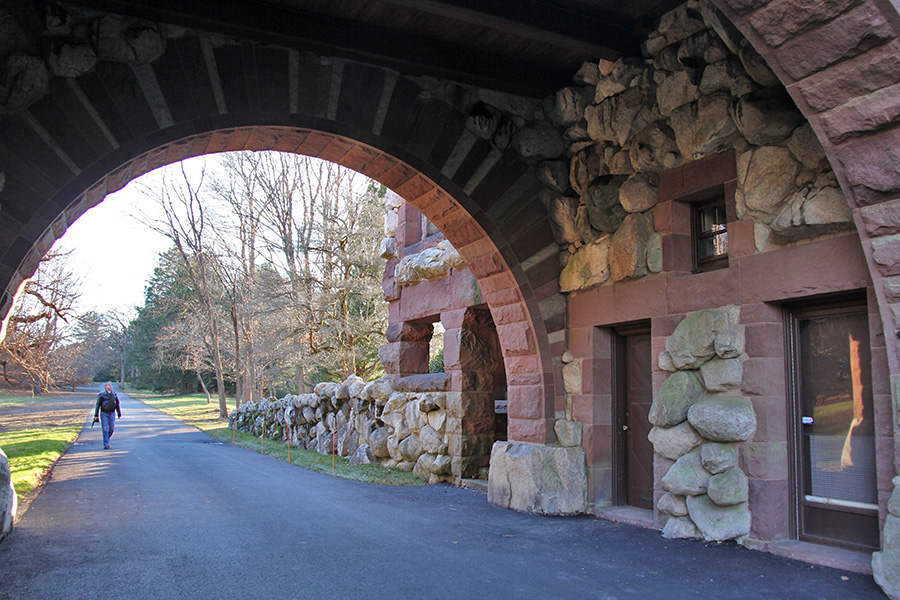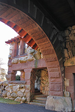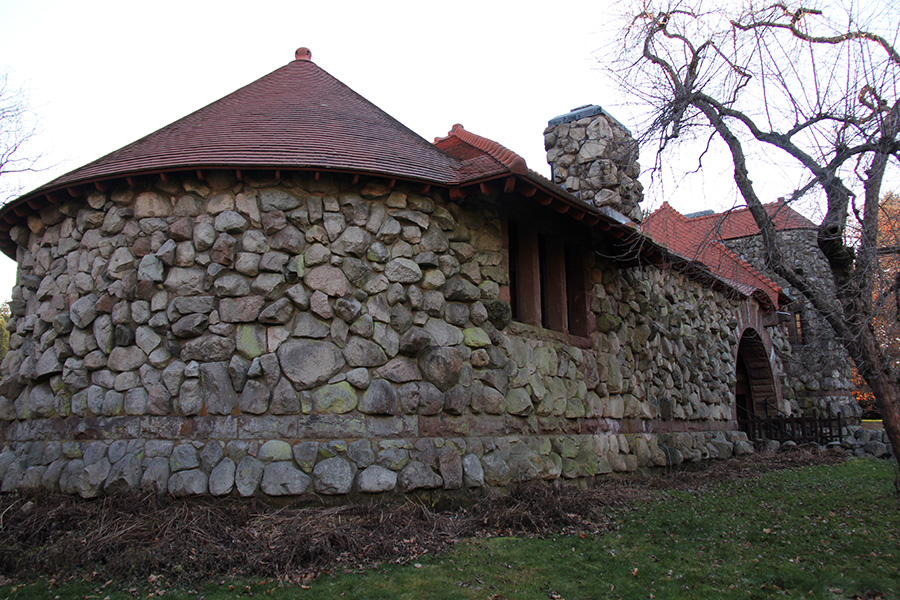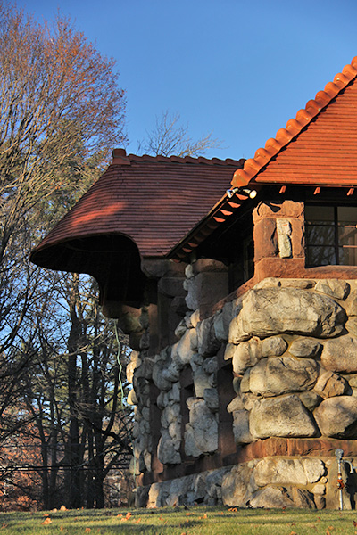 the gate lodge was just that: a gate that you passed through in order to get to the main mansion further down the private drive. it was designed with living spaces for the on-duty attendants, and the place was definitely inhabited, although we didn't see anyone. the gate lodge is atypical in its use of unshaped stones, which gaves the structure a rustic cottage-like appearance. the entrance is also unique in the number of different colored stones. we walked around the lodge, seeing it from all angles. it's just unfortunate that it was already late afternoon and with the sun close to setting most of the lodge was in shadows.