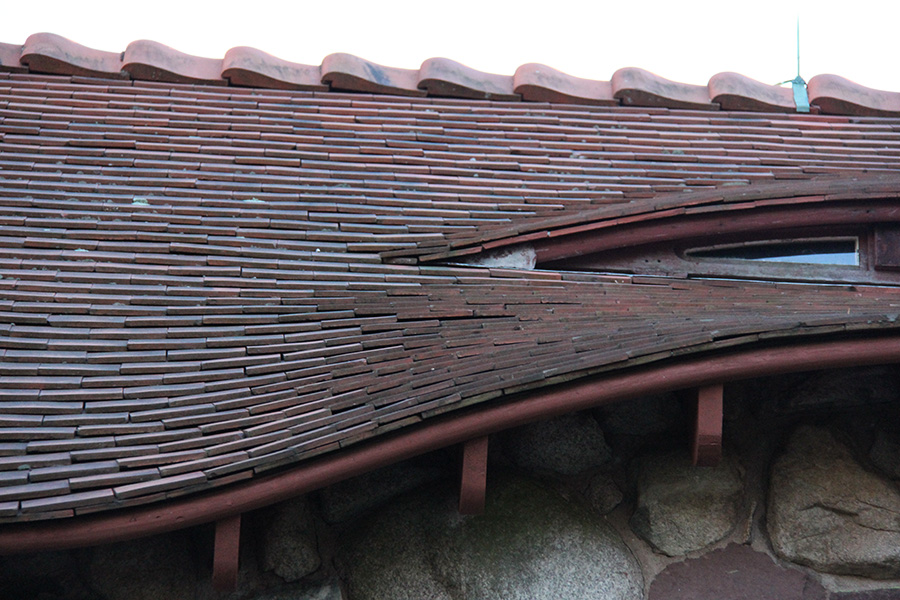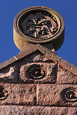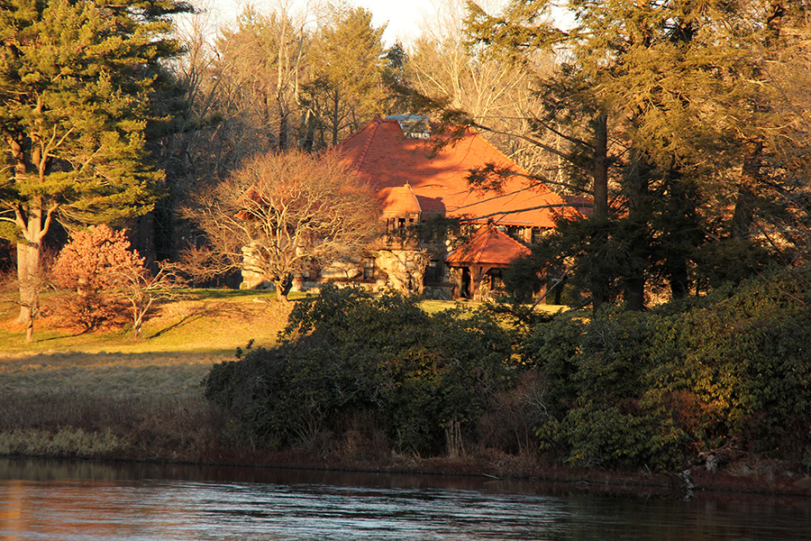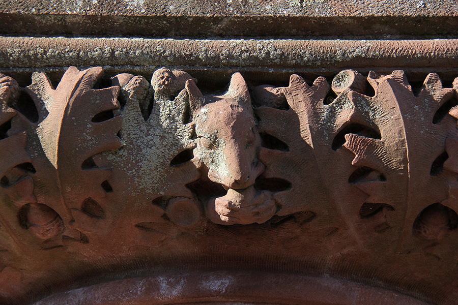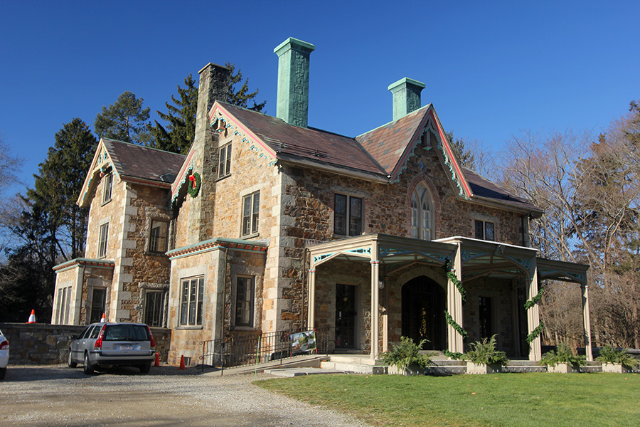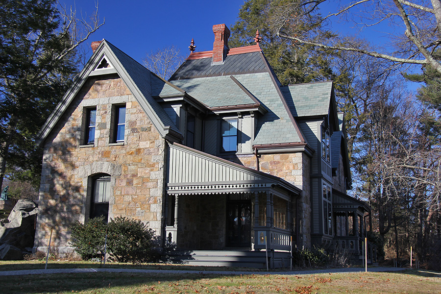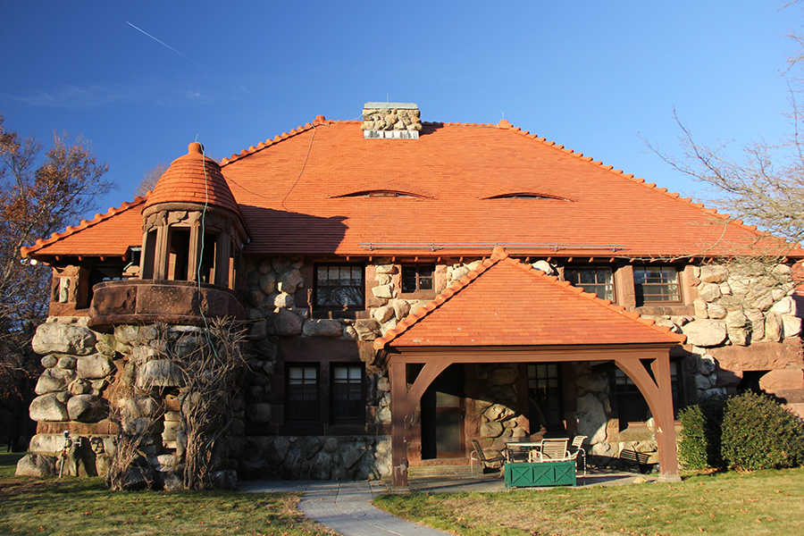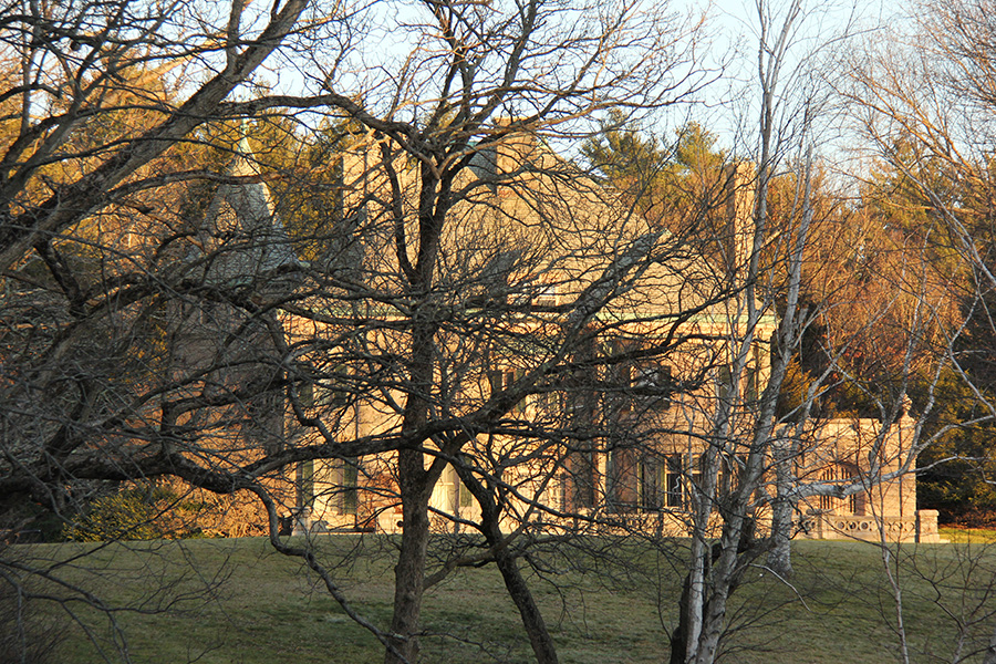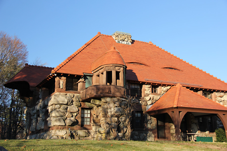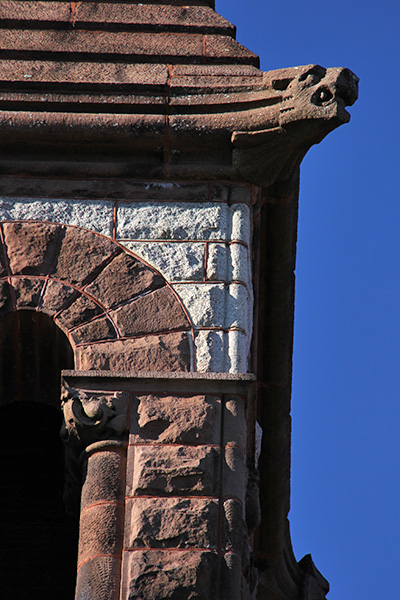 the gate lodge was just that: a gate that you passed through in order to get to the main mansion further down the private drive. it was designed with living spaces for the on-duty attendants, and the place was definitely inhabited, although we didn't see anyone. the gate lodge is atypical in its use of unshaped stones, which gaves the structure a rustic cottage-like appearance. the entrance is also unique in the number of different colored stones. we walked around the lodge, seeing it from all angles. it's just unfortunate that it was already late afternoon and with the sun close to setting most of the lodge was in shadows.