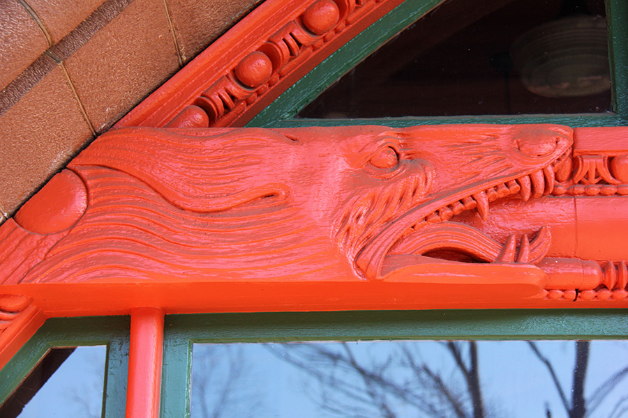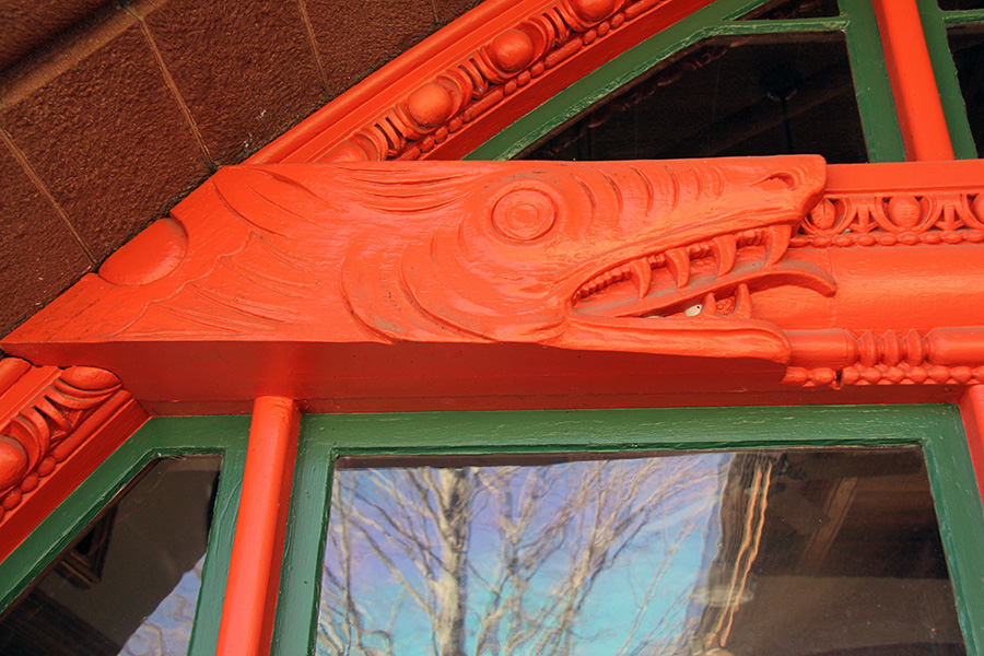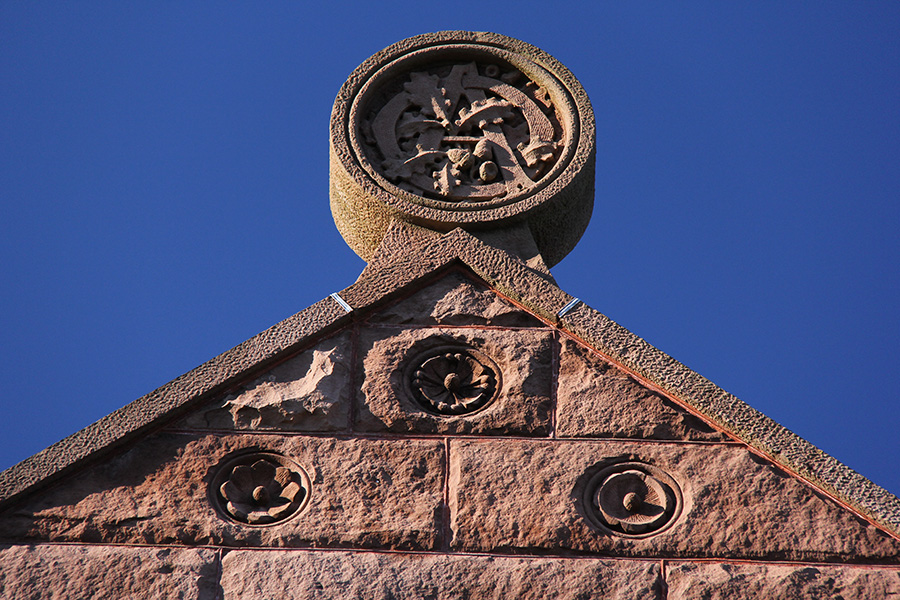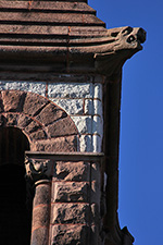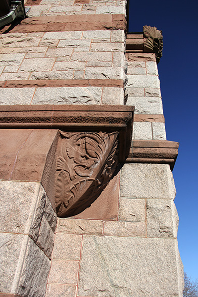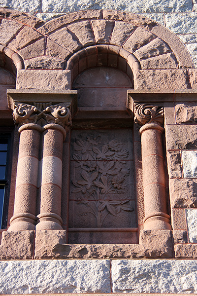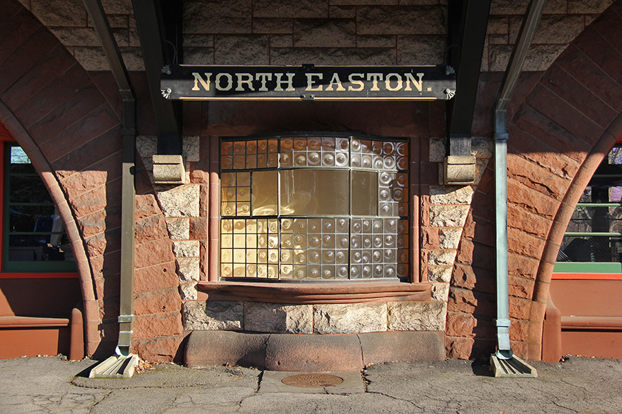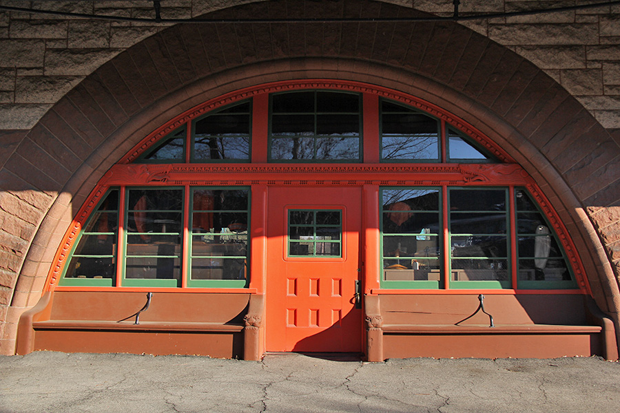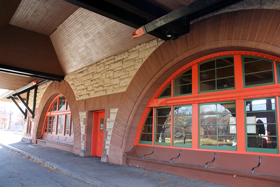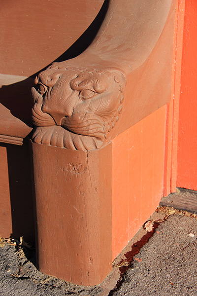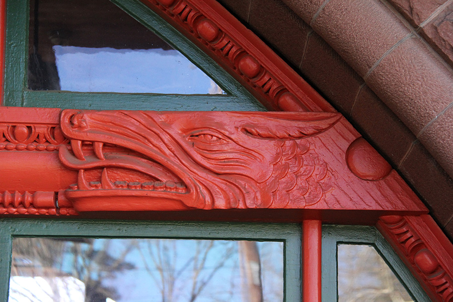 we could've talked to dick all day but we had more places to see. besides, drew had to go use the bathroom, and we were both getting hungry (it was close to 1:30 by that point). we drove off on oliver street and came across richardson's old colony railroad station - now the headquarter for the easton historical society. originally i didn't plan to stop, but since we were there, we got out to take a quick look. it's not as grand as the memorial hall or library, but it does have its romanesque charm, like the arched doorways and large multi-colored stonework. there were also interesting wooden carvings of either dragons or wolves on the beams across the doorways, as we as carvings of cat-like beasts (lions?) on the hand rests of the benches.