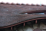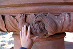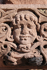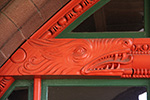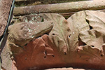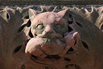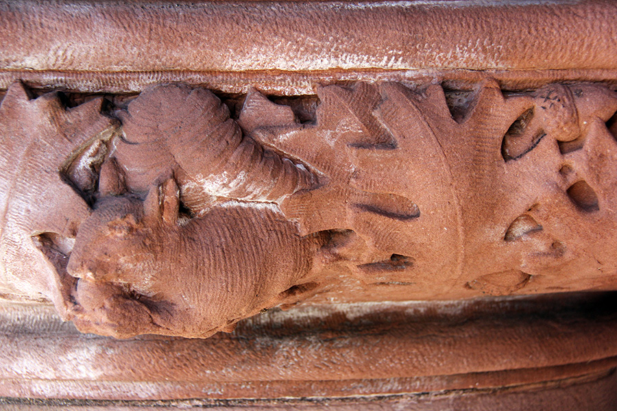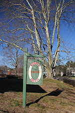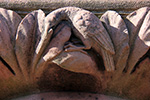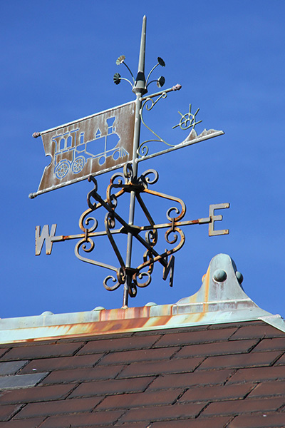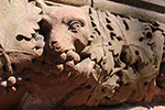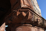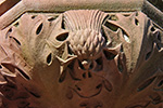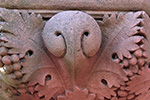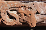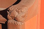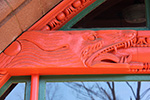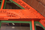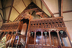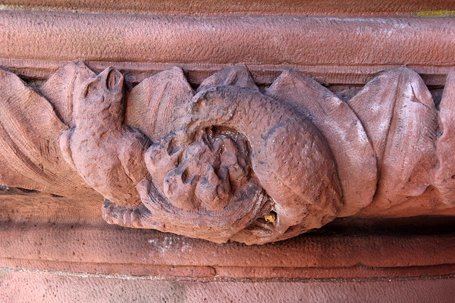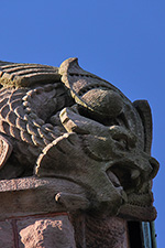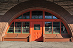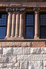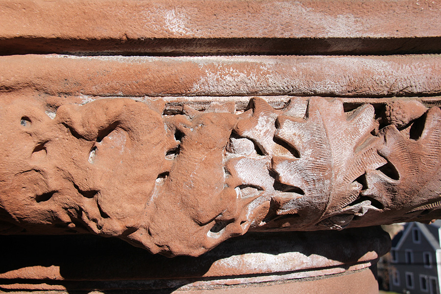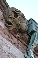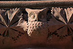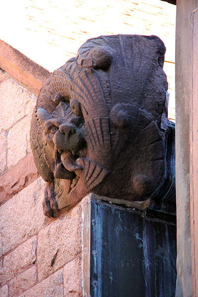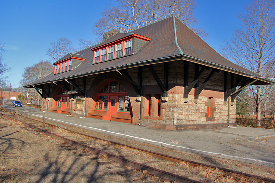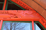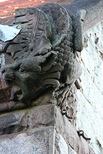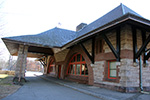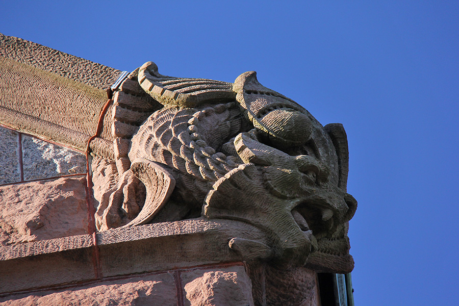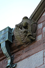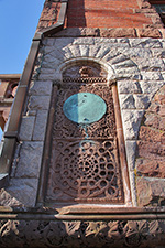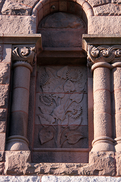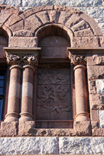 we could've talked to dick all day but we had more places to see. besides, drew had to go use the bathroom, and we were both getting hungry (it was close to 1:30 by that point). we drove off on oliver street and came across richardson's old colony railroad station - now the headquarter for the easton historical society. originally i didn't plan to stop, but since we were there, we got out to take a quick look. it's not as grand as the memorial hall or library, but it does have its romanesque charm, like the arched doorways and large multi-colored stonework. there were also interesting wooden carvings of either dragons or wolves on the beams across the doorways, as we as carvings of cat-like beasts (lions?) on the hand rests of the benches.