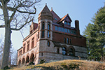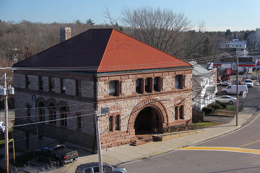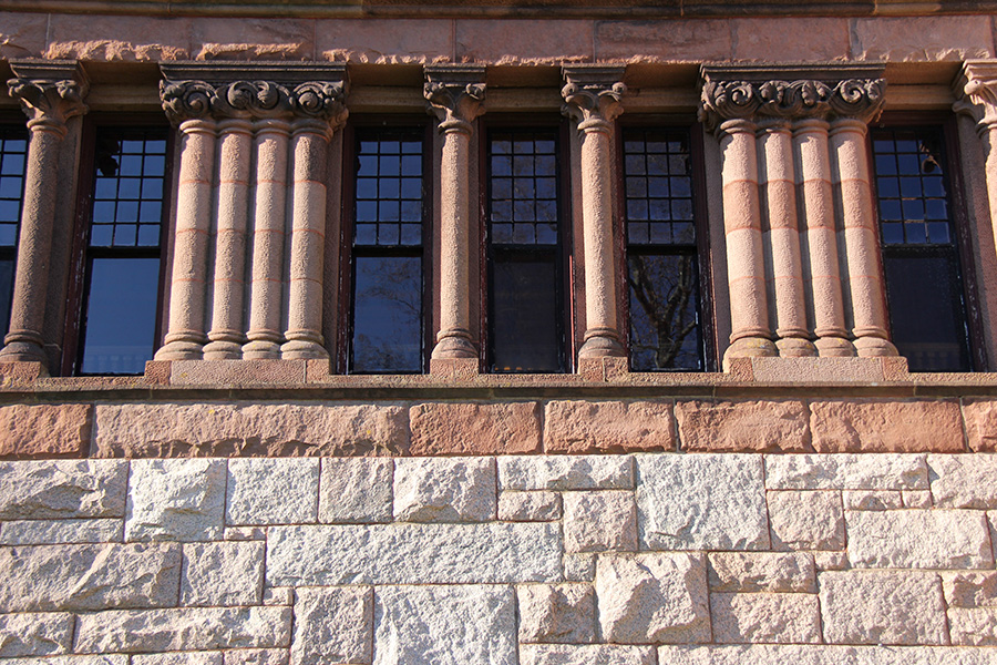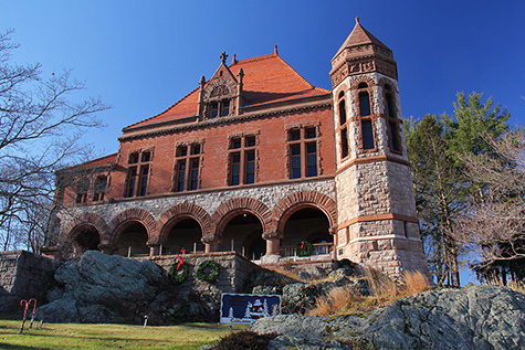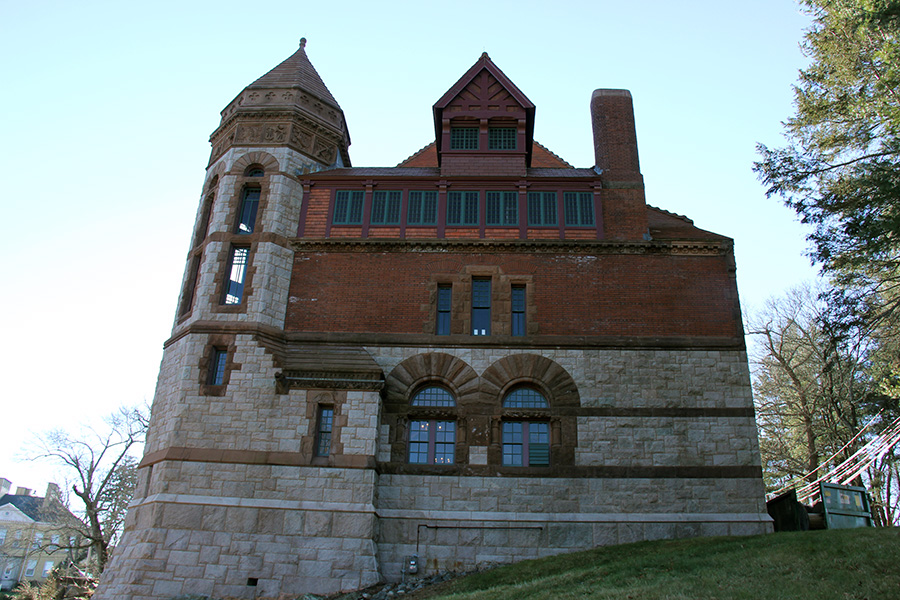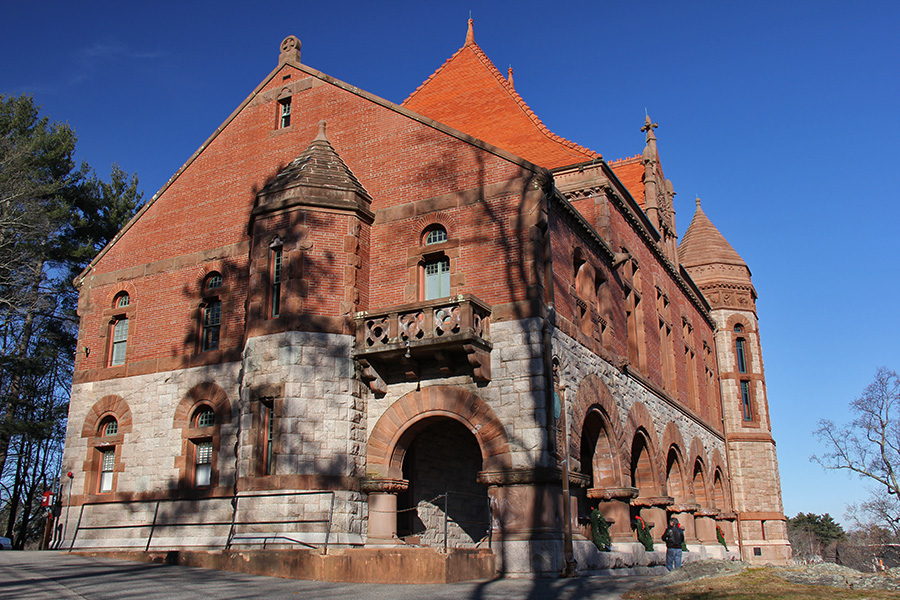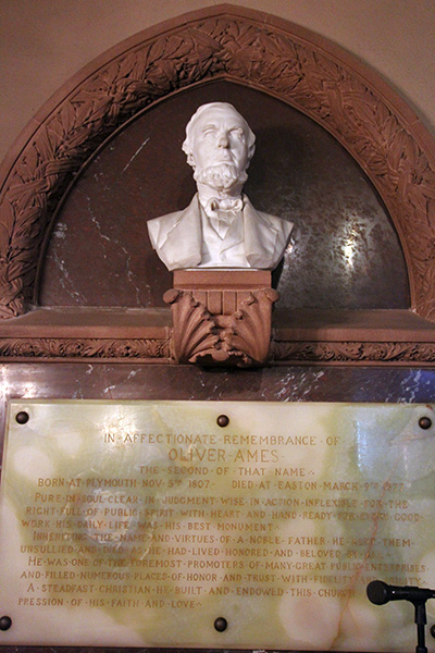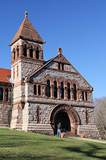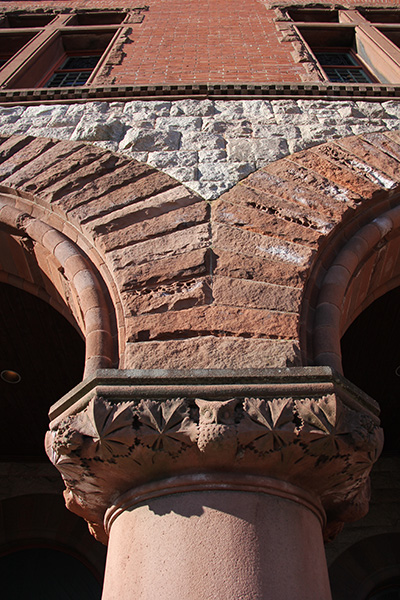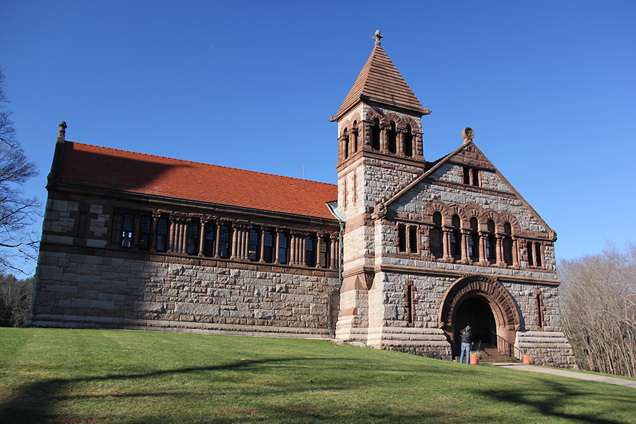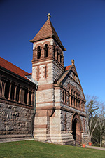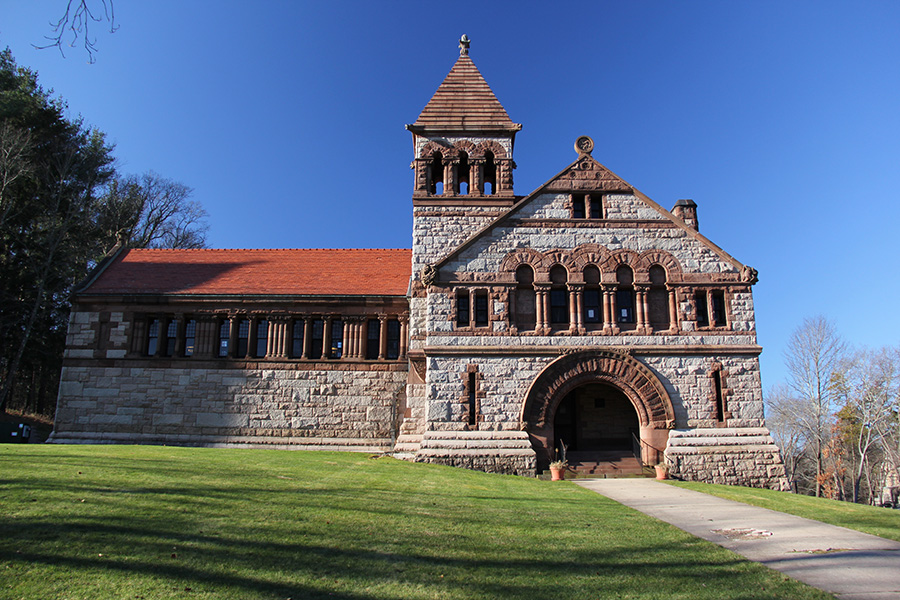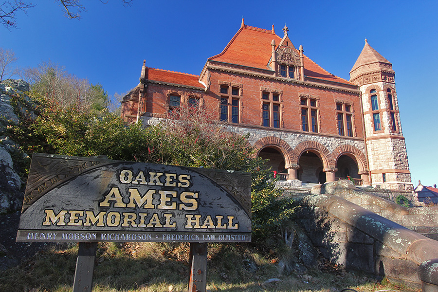 we arrived in north easton around 10:00. there was no mistaking we were in the right place because as soon as we reached the western bend of main street we saw two large richardsonian buildings up on a hill. in the excitement i almost pulled the car over but we drove a a bit ahead to park in the lot behind the ames free library. we got out to get our architecture on.