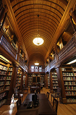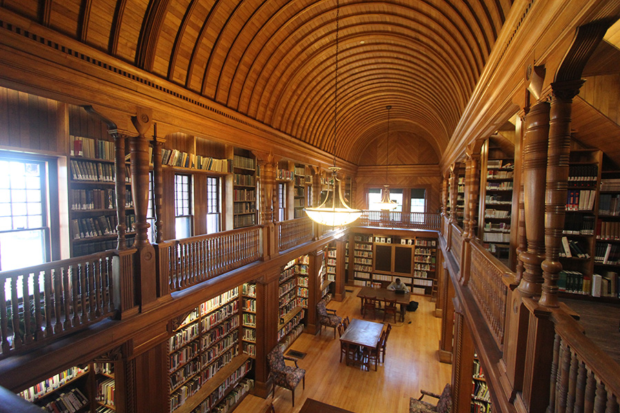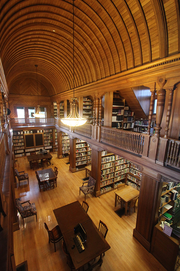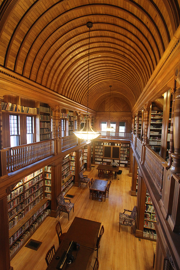 after spending some more time taking photos of the memorial hall exterior (including 66 main street across the street, designed by shepley, rutan & coolidge), we moved back to the library, this time to see what was inside. the central book stacks was pretty amazing, all wood from floor to tall ceiling. the library printed out some more info for us and even let us go up onto the second floor which is usefully off-limits due to low railings.